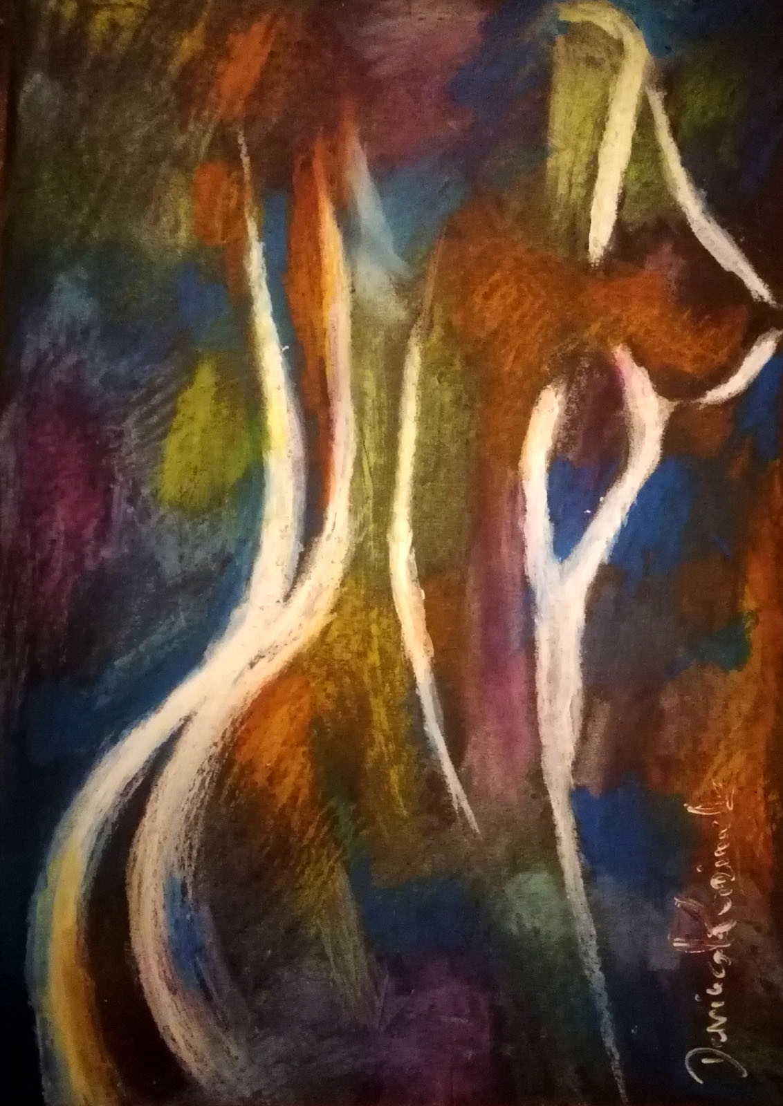 Akt kobiecy wykonany pastelami olejnymi i białym węglem na czarnym papierze formatu A4 (29.7x21cm). Obraz przed wysyłką zostanie oprawiony w antyramkę. Praca z 2026 r.