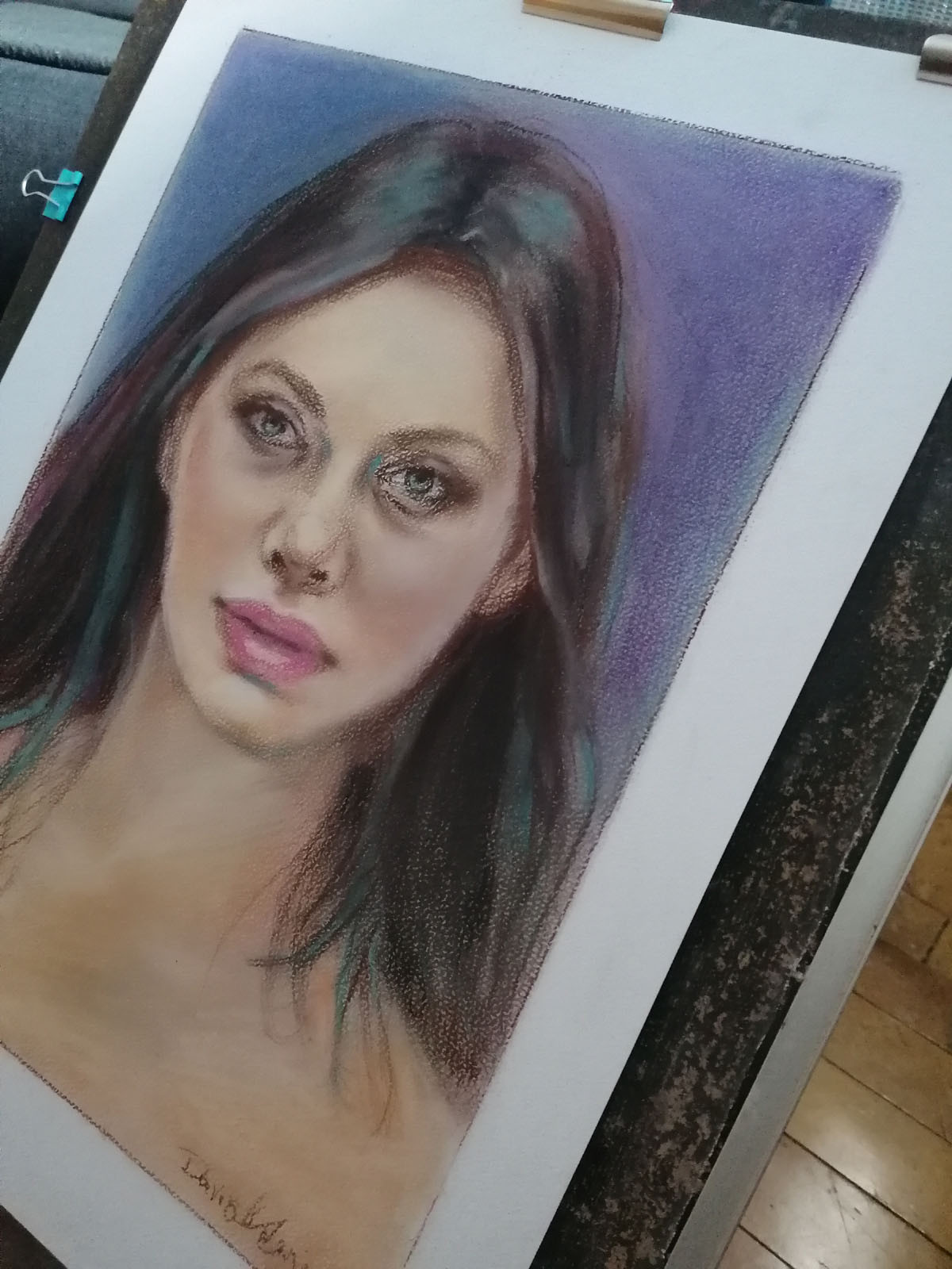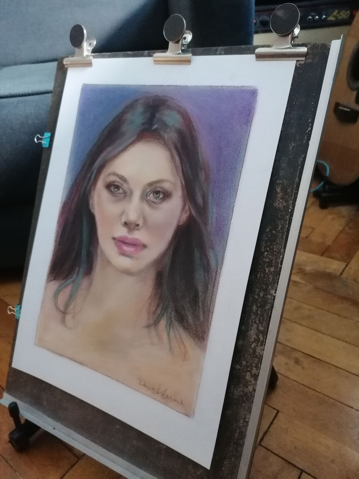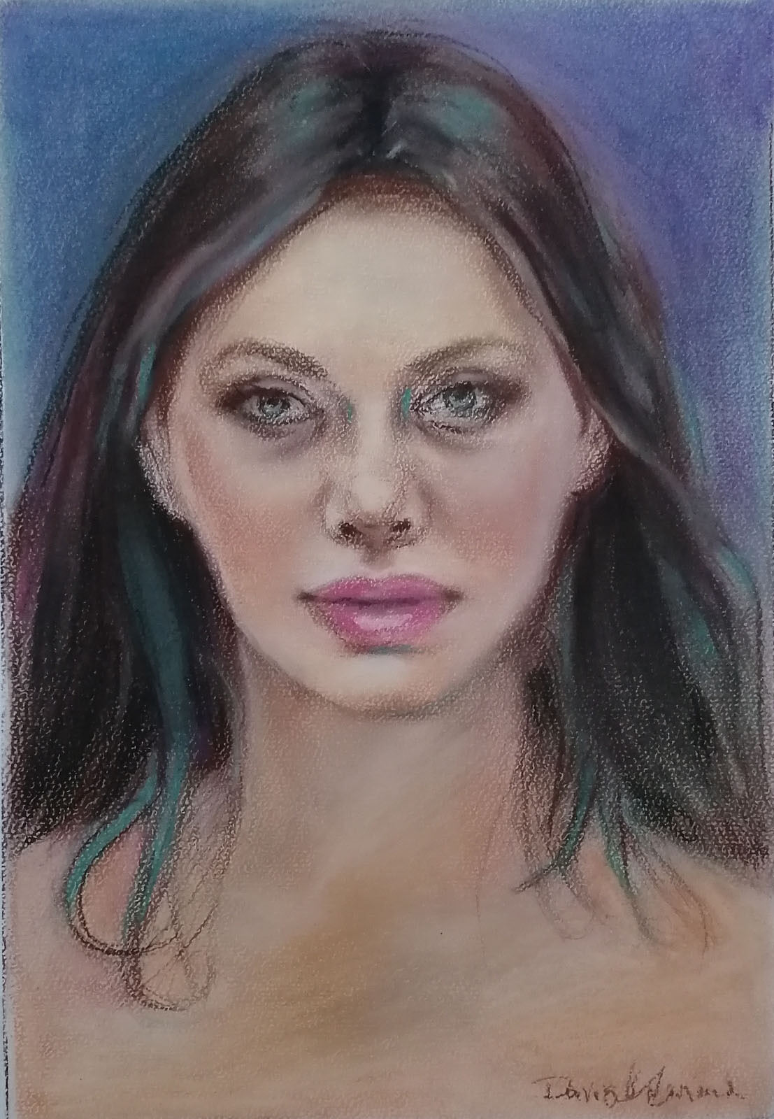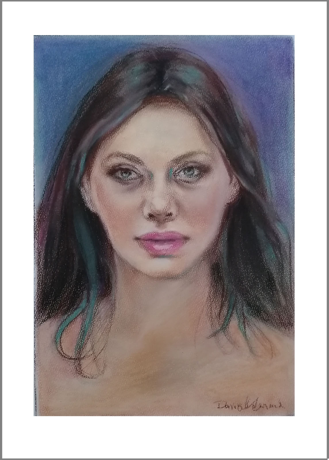 Praca z cyklu Kobieta z wymyśloną twarzą, wykonana pastelami suchymi na dobrej jakości papierze akwarelowym z charakterystyczną fakturą, widoczną na zdjęciu nr. Format A3 - 42x29,7cm/ okno passepartout - 34,5x23,5cm. Papier o gramaturze 300 g/m2. Rysunek przedstawia kobietę wydobytą gdzieś z wyobraźni, być może z pamięci z wymyśloną twarzą (wszelkie podobieństwo jest więc dziełem przypadku}. W pewnym sensie jest to również akt, w którym nagość pozostaje poza obszarem kadru oraz próba zatrzymania przemijającej kobiecej urody, chwili, podobnie jak delikatne i ulotne są suche pastele wybrane do wykonania tego zadania. Powierzchnia zabezpieczona przed rozcieraniem. Moja sygnatura w prawym dolnym rogu. Obraz przed wysyłką zostanie oprawiony w antyramkę. Całość gotowa do powieszenia na ścianie.