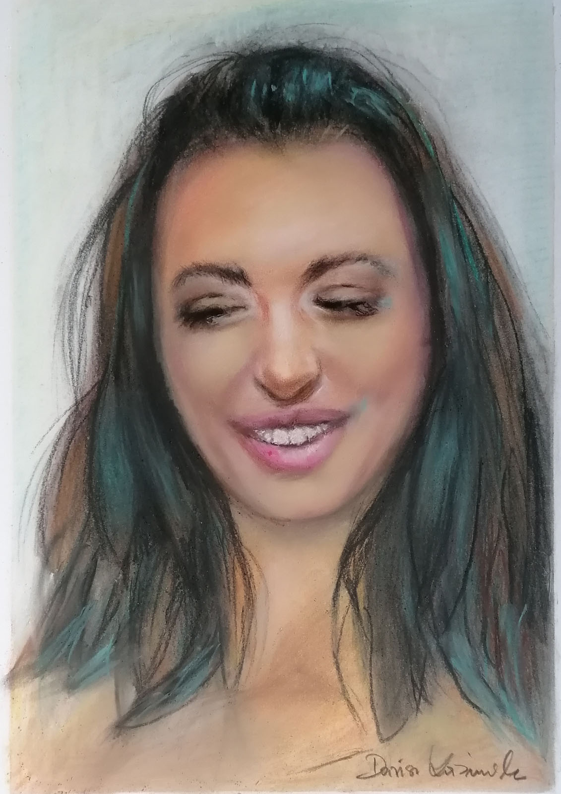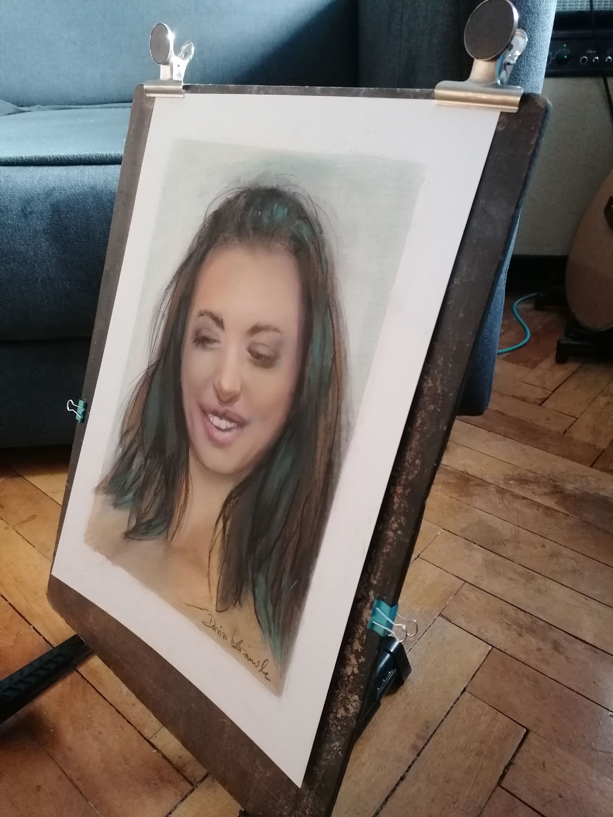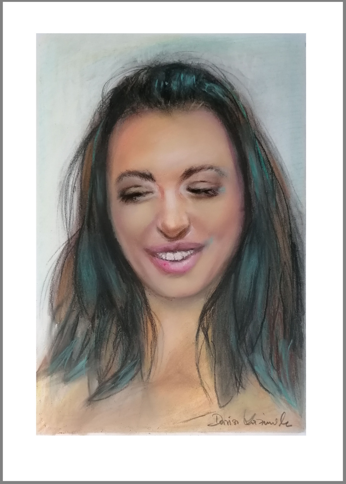 Praca wykonana pastelami suchymi na białym papierze o wymiarach 42x29,7cm/ okno passepartout - 34,5x23,5cm i gramaturze 300g/m2. Powierzchnia została zabezpieczona przed rozcieraniem. Obraz powstał w 2026 r. Twarz zainspirowana kilkoma fotografiami. Jest to także akt, którego główne cechy znajdują się poza kadrem. Kolory na zdjęciach mogą nieco różnić się od rzeczywistych. Przed wysyłką portret zostanie oprawiony w antyramkę. Całość gotowa do powieszenia na ścianie.