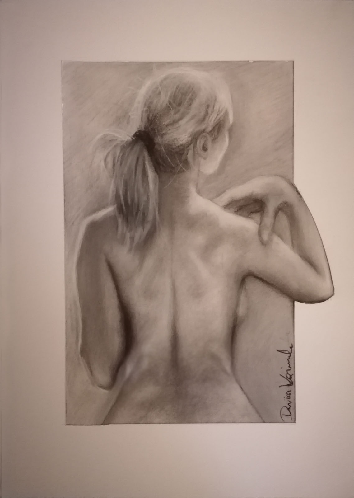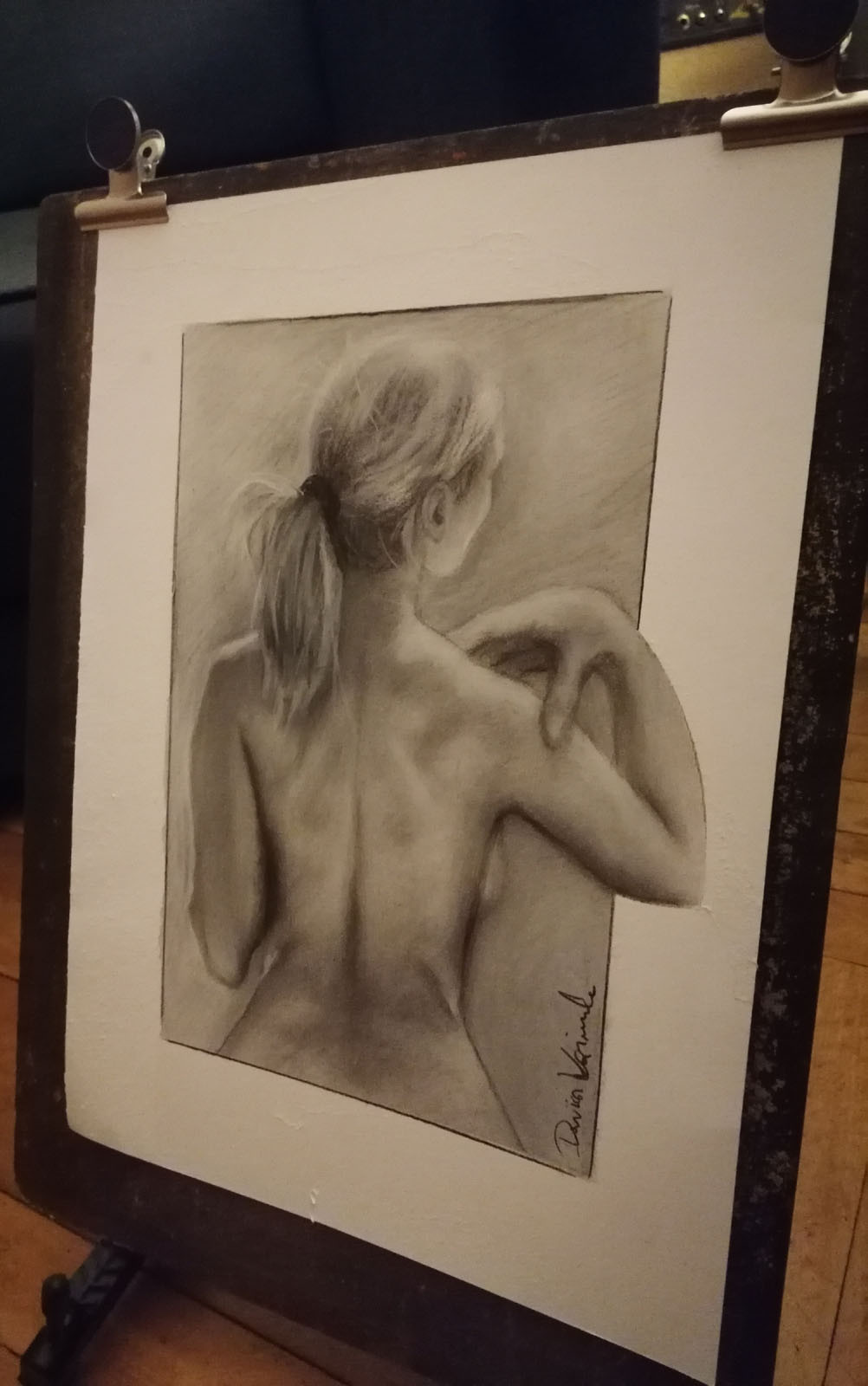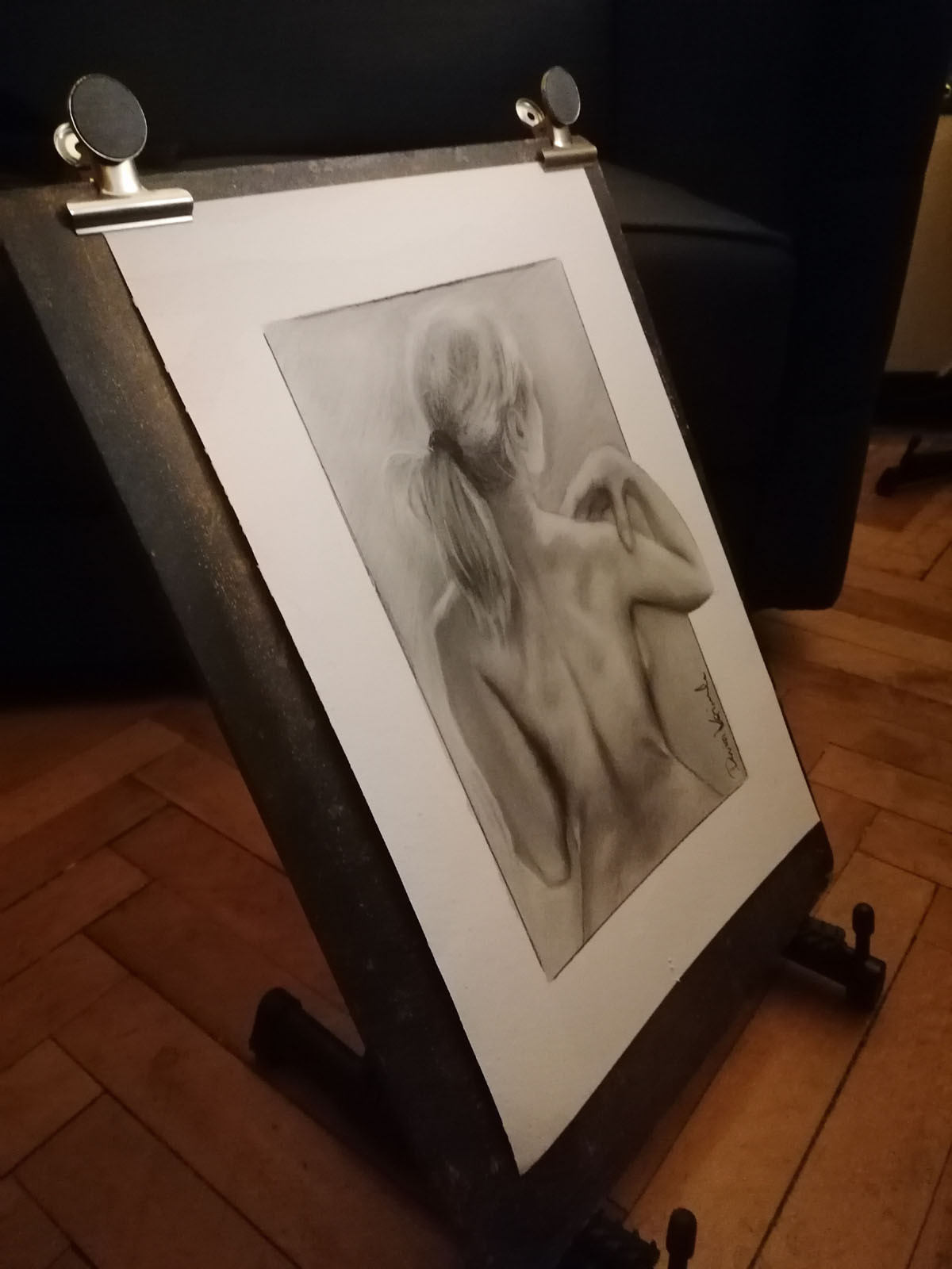 Obraz wykonany czarnym i białym węglem na kartonie o wymiarach 30,5x19,5cm, passepartout 42x29,7cm. Grubość papieru 250g/m2. Łokieć postaci kobiety wykraczający poza obszar tła. Powierzchnia zabezpieczona przed rozcieraniem. Praca przed wysyłką zostanie oprawiona w antyramkę. Całość gotowa do powieszenia na ścianie.