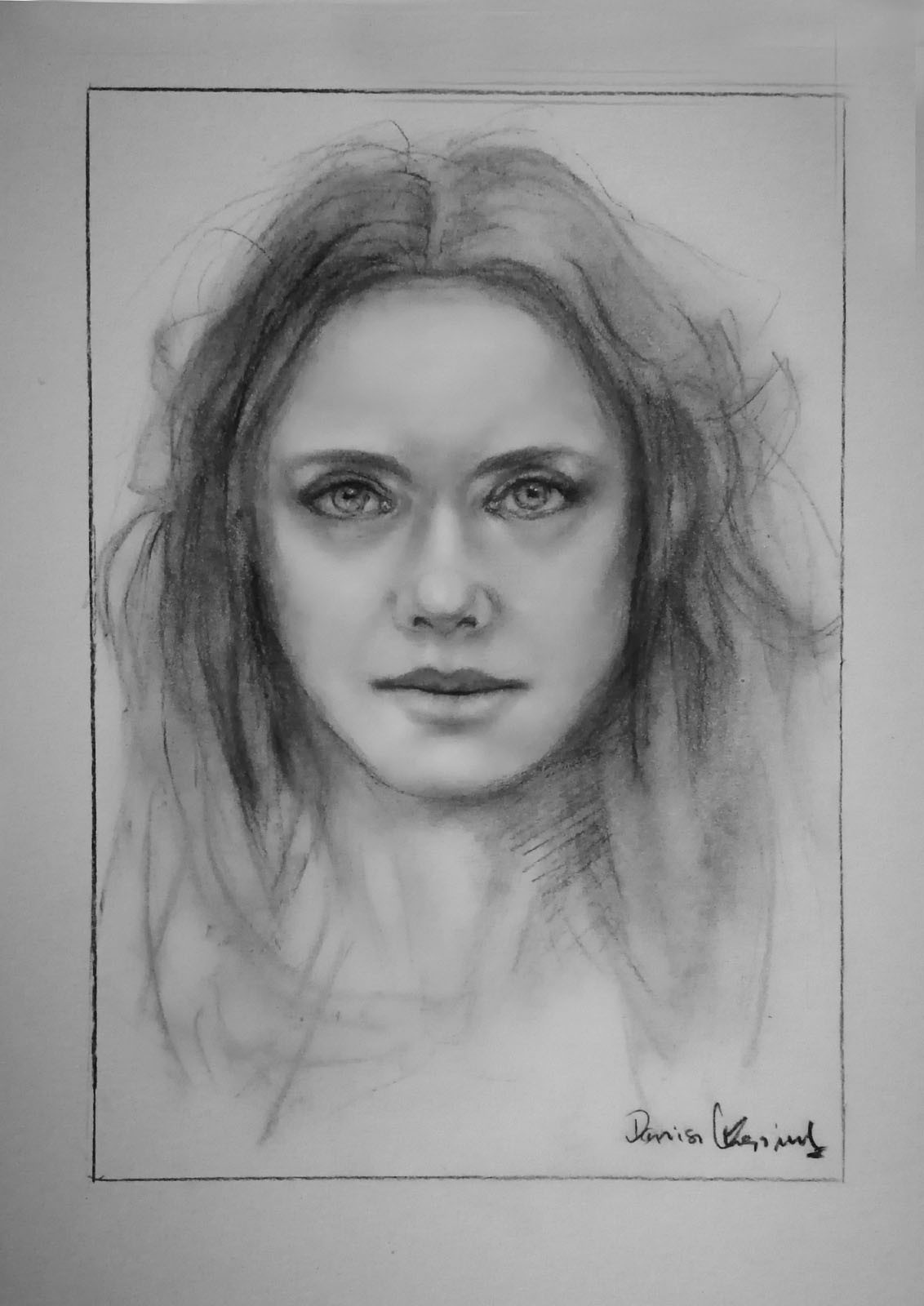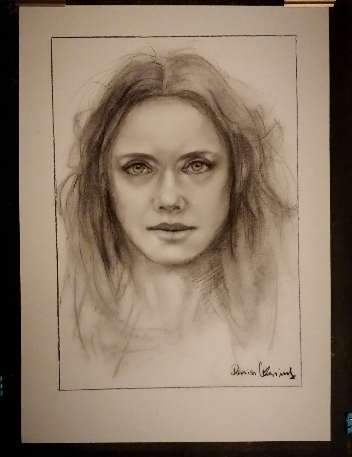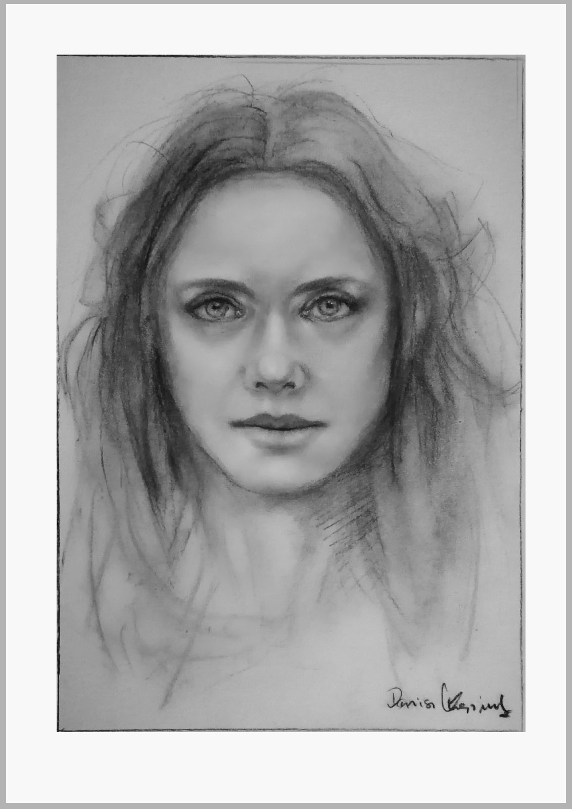 Rysunek twarzy kobiety wykonany z wyobraźni węglem na białym kartonie formatu A3 - 42x29,7cm/passepartout 34x23,5cm i grubości 250g/m2. Powierzchnia zabezpieczona przed rozcieraniem. Na jednym ze zdjęć cieplejszy odcień przy wieczornym nocnym oświetleniu. Obraz przed wysyłką zostanie oprawiony w antyramkę z szybką plexi. Całość gotowa do powieszenia na ścianie. Praca z 2026 r. Sygnatura w prawym dolnym rogu. Chciało by się rzec: Ktokolwiek widział, ktokolwiek wie...