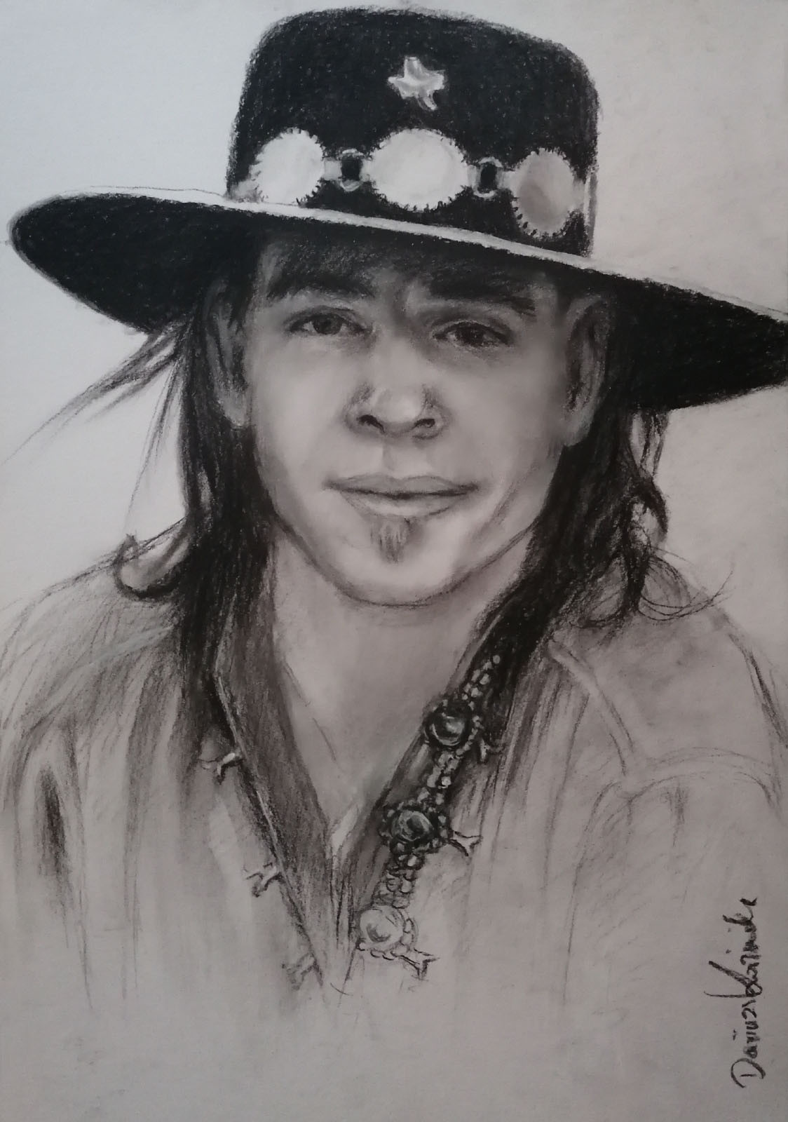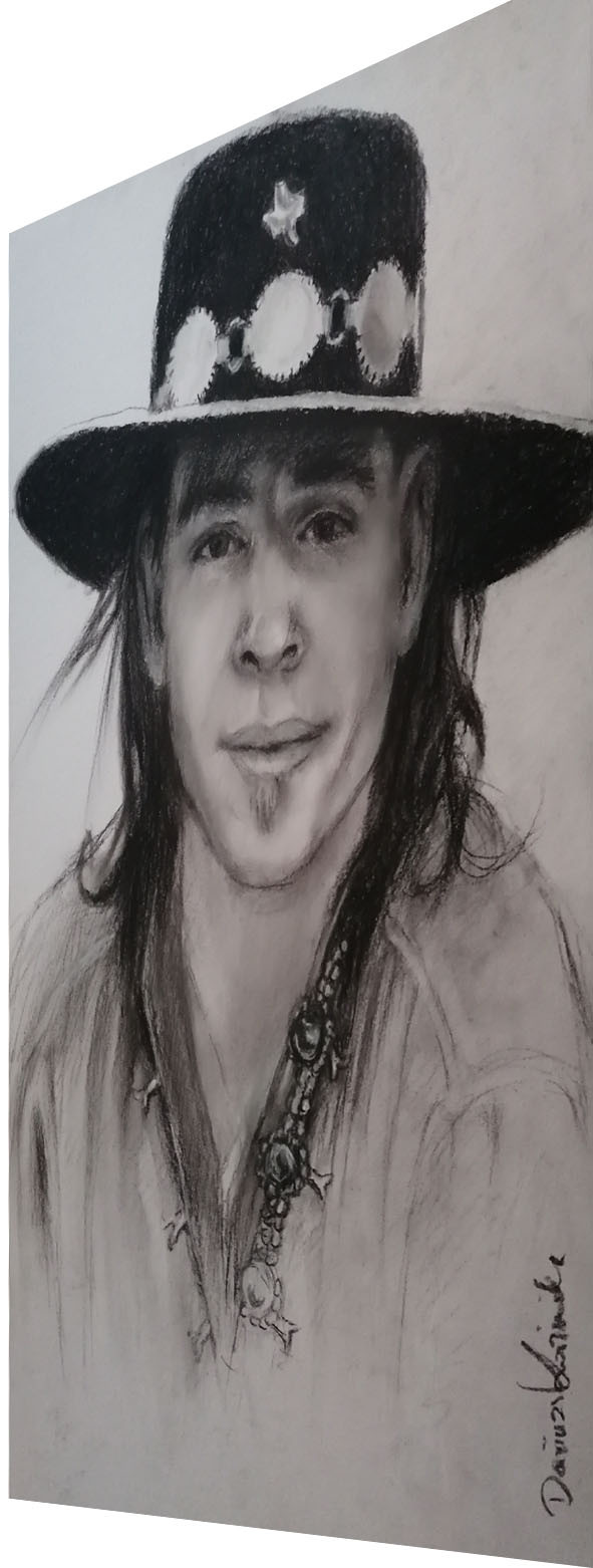 Portret legendarnego gitarzysty bluesowego Steviego Ray Vaughana wykonany węglem na papierze o gramaturze 250 g/m2 o wymiarach A3 - 42x 29,7 cm. Moja sygnatura w prawym dolnym rogu. Obraz jest zabezpieczony przed rozcieraniem i przed wysyłką zostanie oprawiony w antyramkę. Rok powstania 2026.