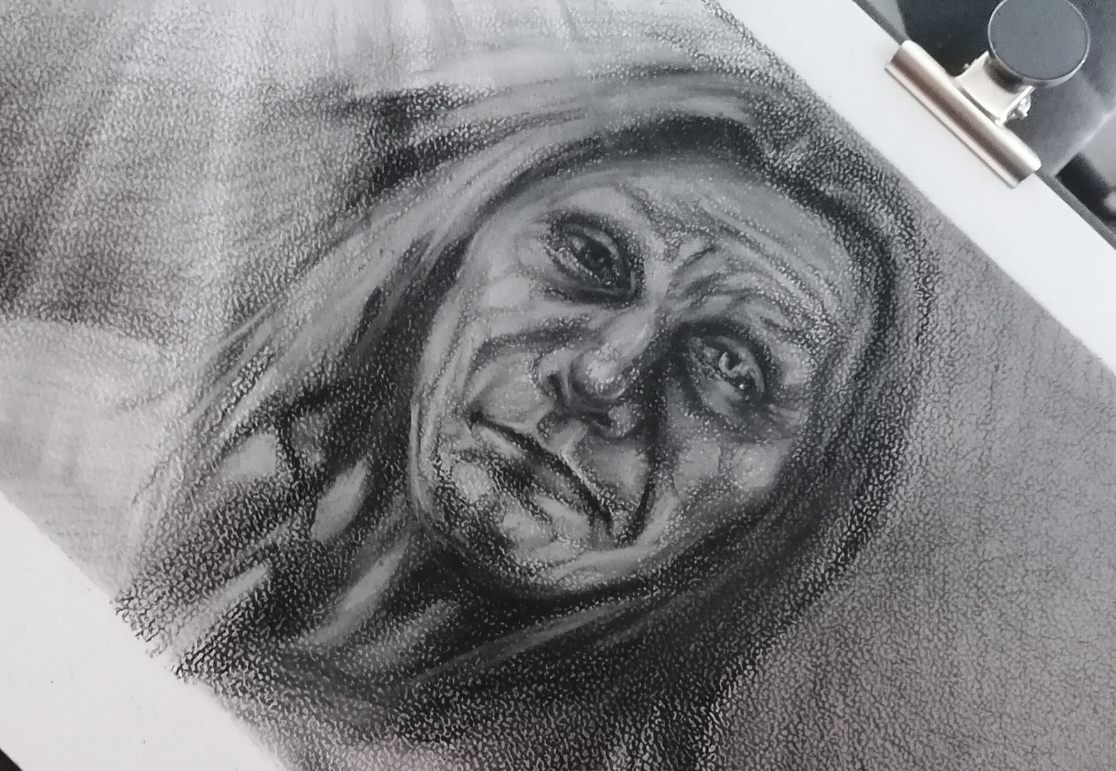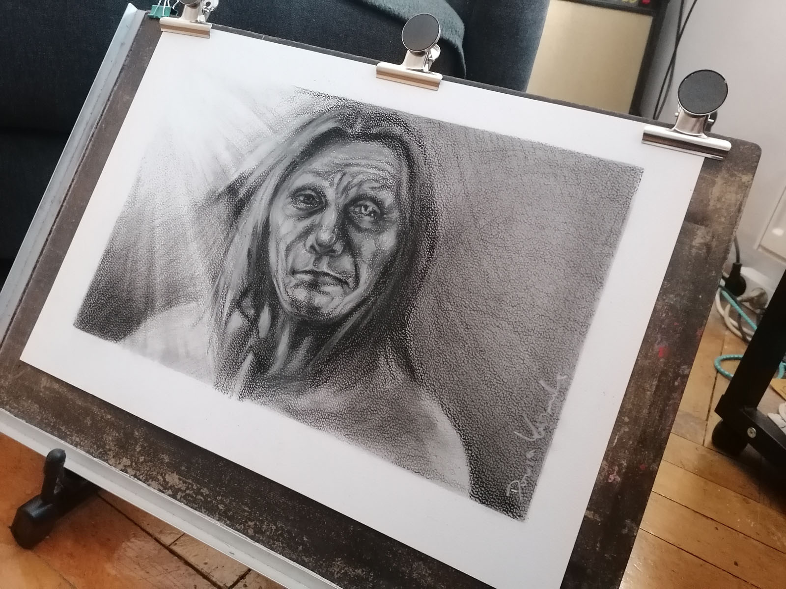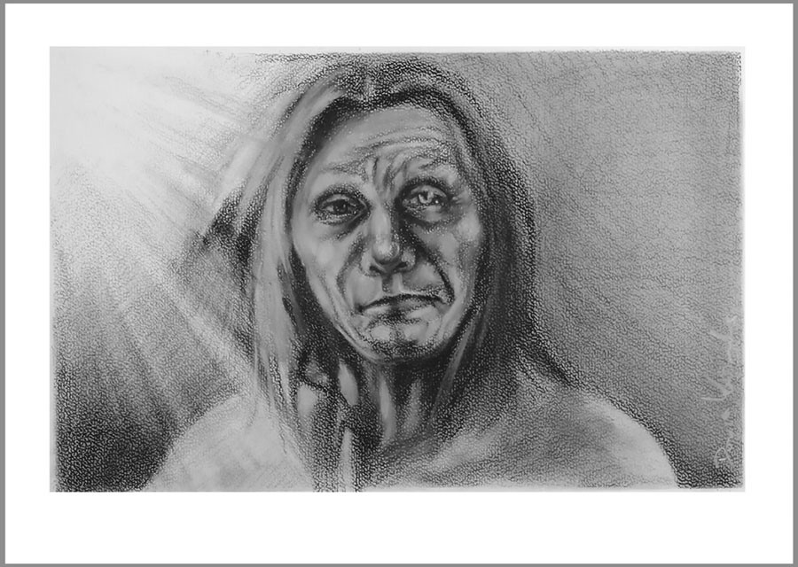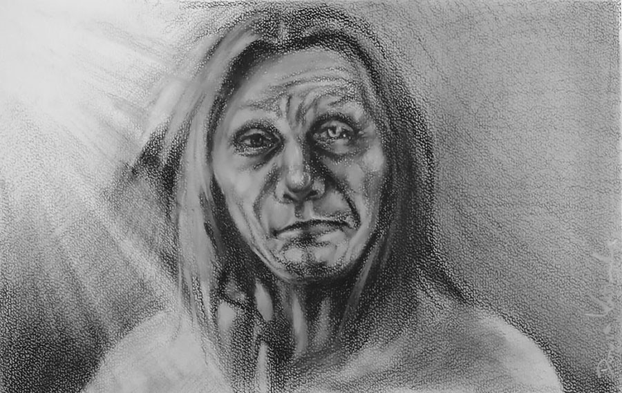 Rysunek czarnym i białym węglem przedstawiający indiańskiego szamana dawnego, wytępionego mieszkańca Ameryki Północnej - Praca wykonana na podstawie wcześniej sporządzonego szkicu inspirowanego starą autentyczną fotografią znalezioną w sieci. Zdjęcia obecnie niestety nie mogę zlokalizować i nie wiem kto dokładnie został uwieczniony. Charakterystyczną cechą jest tęczówka oka z jaśniejszą barwą być może na skutek urazu, a być może tak ułożyło się światło podczas uwolnienia migawki. A być może to jeszcze coś innego... Obraz ma nieco creepy charakter. Spory blik światła po lewej stronie został dodany przeze mnie. Podobrazie - papier akwarelowy o gramaturze 300g/m2. i charakterystycznej fakturze widocznej na zdjęciach. Wymiary 42x29,7cm, okno passpartout 35,5x22,5cm. Praca przed wysyłką zostanie oprawiona w antyramkę. Sygnatura autora w prawym dolnym rogu oraz na odwrocie. Całość gotowa do powieszenia na ścianie.