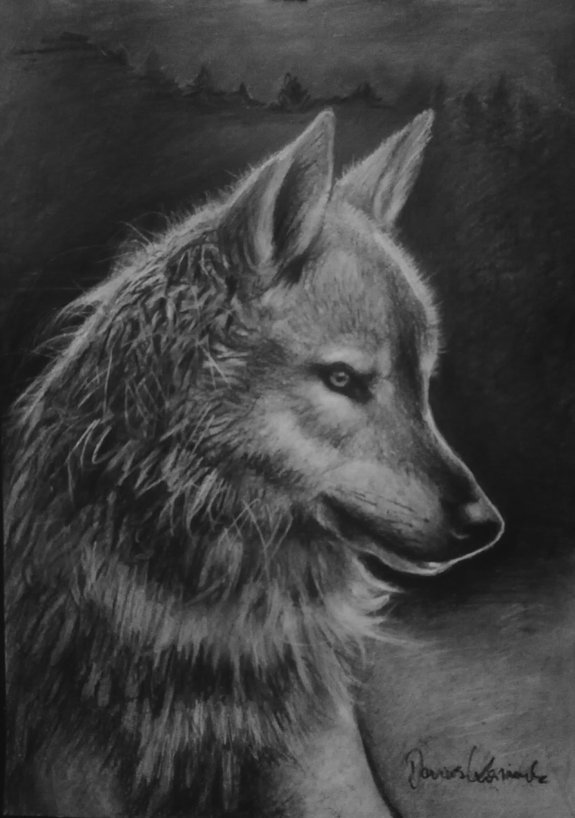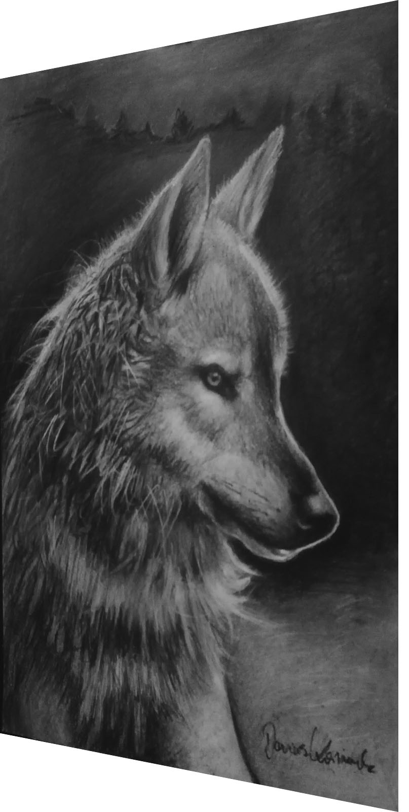 Obraz wykonany techniką czarnego i białego węgla na papierze o gramaturze 250g/m2 i formacie A3 (42x29,7cm), przedstawiający legendarnego leśnego drapieżnika - protoplastę największego przyjaciela człowieka. Od strony technicznej jest to próba sprzęgnięcia ze sobą swobody i precyzji - w uchwyceniu kształtu i charakterystycznych cech zwierzęcia oraz zachowaniu efektu realizmu przy oglądaniu z pewnej odległości. Powierzchnia została zabezpieczona przed rozcieraniem. Praca przed wysyłką zostanie oprawiona w antyramkę.