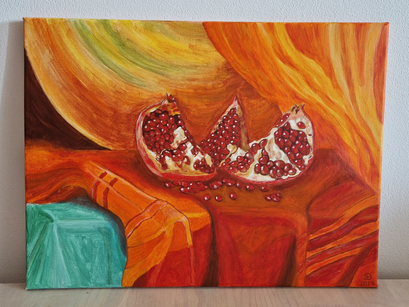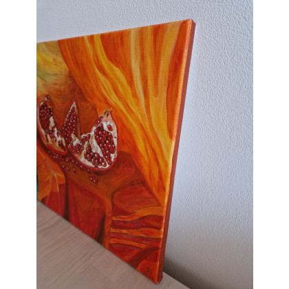 Obraz naciągnięty na blejtram, ma zamalowane boki, sygnowany z przodu i z tylu.