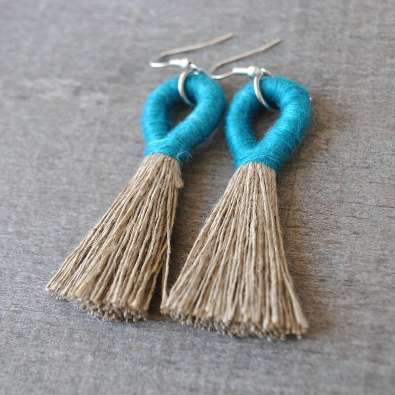 Kolczyki ręcznie wykonane na bazie surowego polskiego lnu w kolorze naturalnym beżowym z turkusowym wykończeniem.