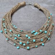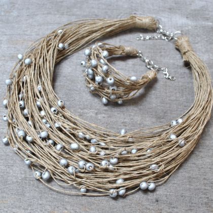 Komplet lniany wykonany ręcznie na bazie nitek naturalnej polskiej przędzy lnianej oraz koralików drewnianych