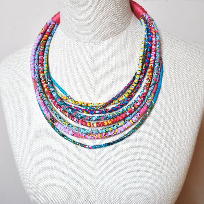 Unikatowy pracochłonny naszyjnik wyplatany na bazie tkaniny oraz lnu