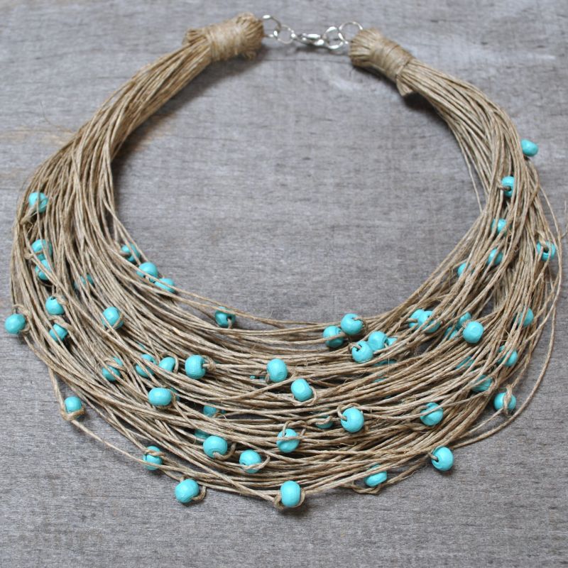 Naszyjnik wykonany ręcznie na bazie nitek naturalnej polskiej przędzy lnianej oraz koralików drewnianych