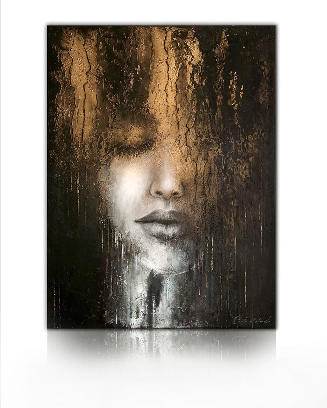 Akryl na płótnie, charcoal, porporina, złota farba w sprayu
