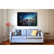 Obraz przedstawia spojrzenie na fasady kamienicy oraz niebo z perspektywy osoby stojącej pośrodku podwórza. Żywe kolory oraz niebanalna faktura naśladująca odpadajacy tynk nadana za pomocą szpachli nadają pracy ciekawy charakter.