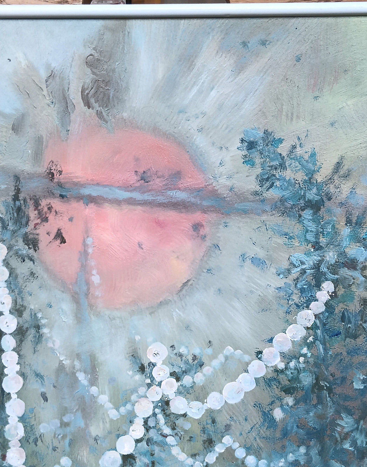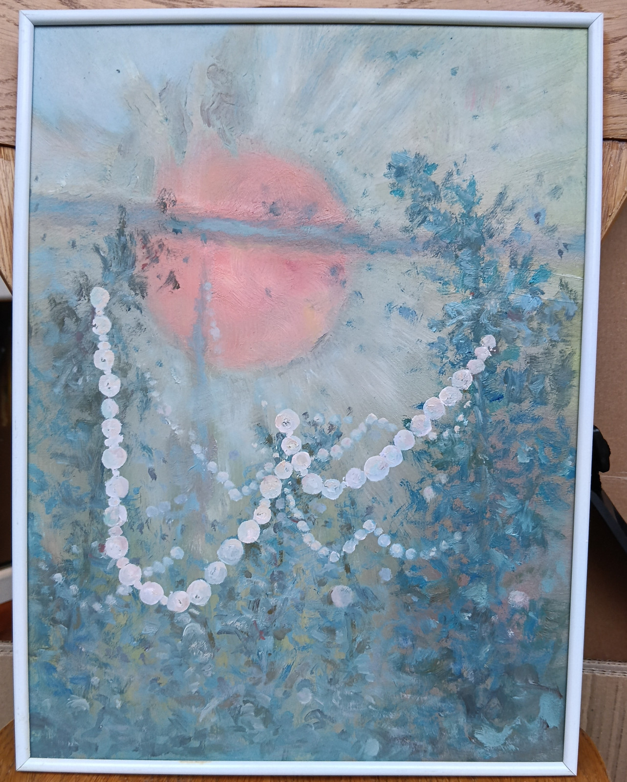 Las we mgle, z wielkim słońcem i sznurami pereł.