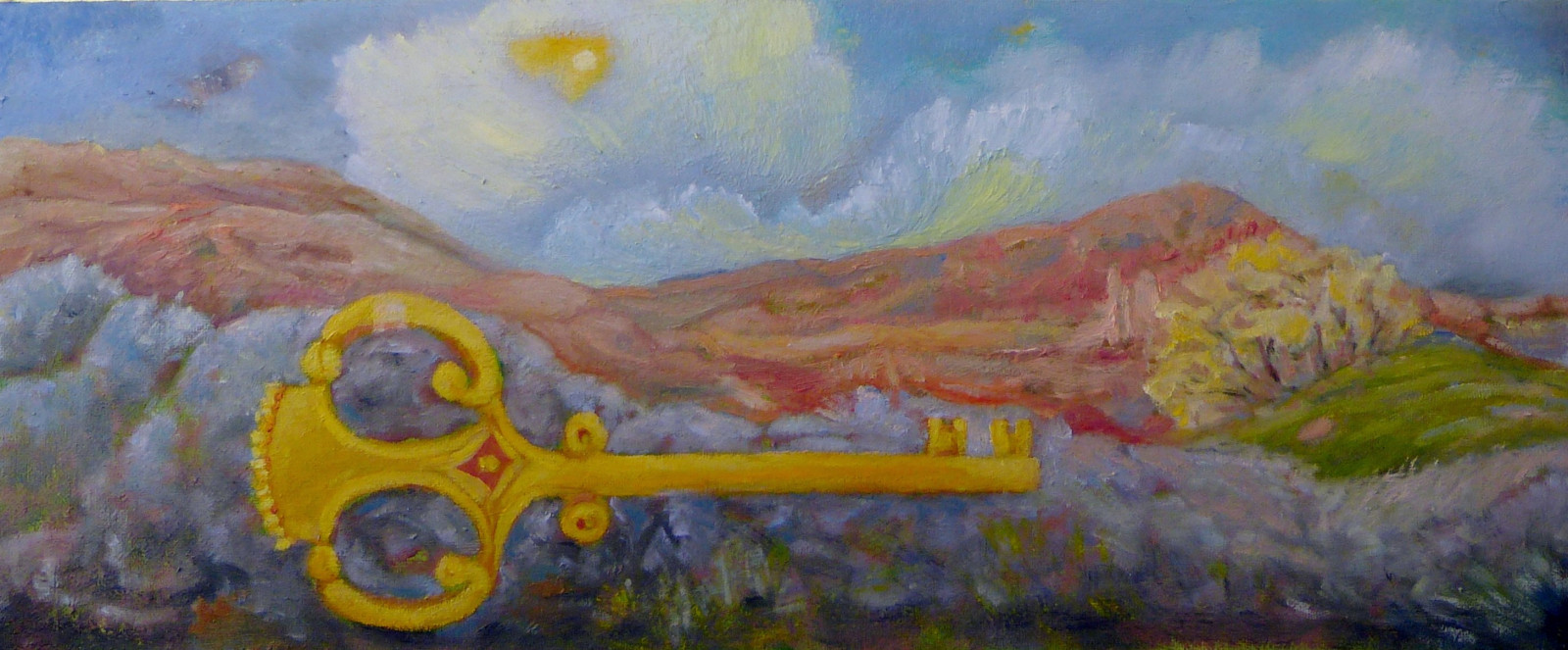 Duży, złoty klucz w pejzażu. Kompozycja pozioma.
