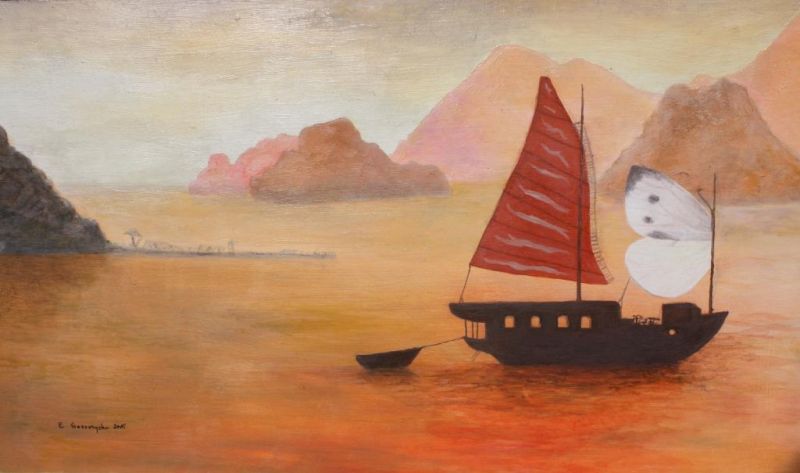 Pejzaż w stylu marynistycznym ze statkiem zdobionym skrzydłem bielinka, wysepkami i spokojną morską przestrzenią. Romantyczny, spokojny. Ciepłe, ale ożywcze koloru.