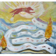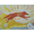 Obraz namalowany farbami olejnymi na płótnie. Przedstawia pejzaż górski latem. W suchej, upalnej scenerii widać czerwonego wilka, który usiłuje wyskoczyć jak najdalej i znaleźć chłodniejsze miejsce do odpoczynku. U dołu obrazu dwa ogniska, podnoszące temperaturę otoczenia. Białe wstęgi to dym, który wije się tuż przy ziemi. Nosi na sobie ślady po wypaleniu iskrami.
