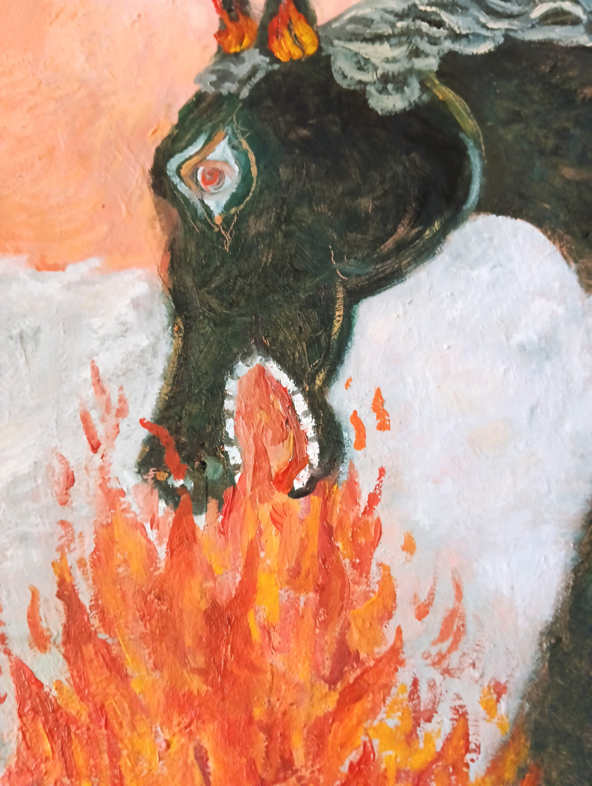 Surrealistyczny portret czarnego konia jedzącego płomienie.