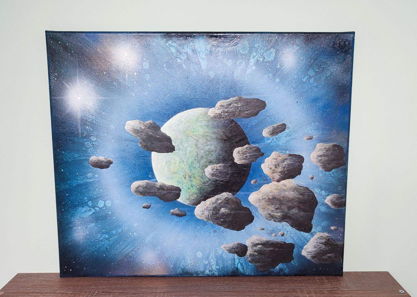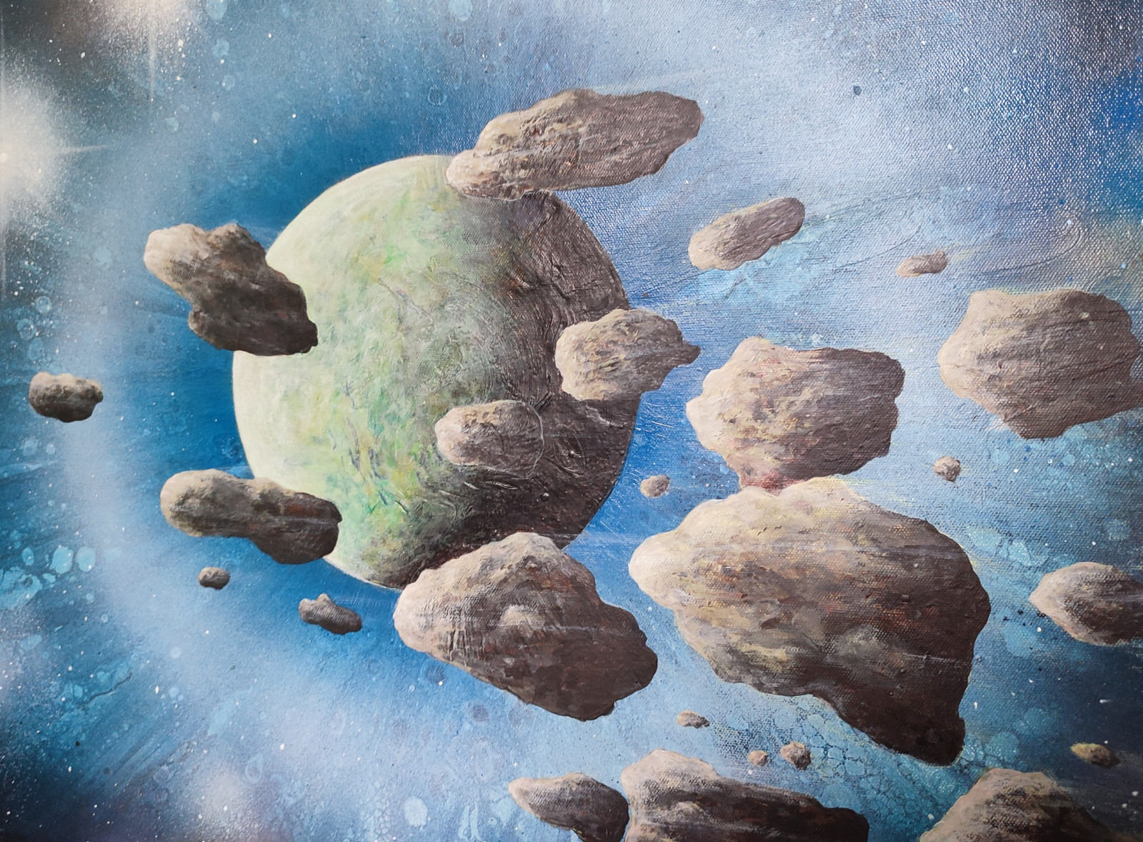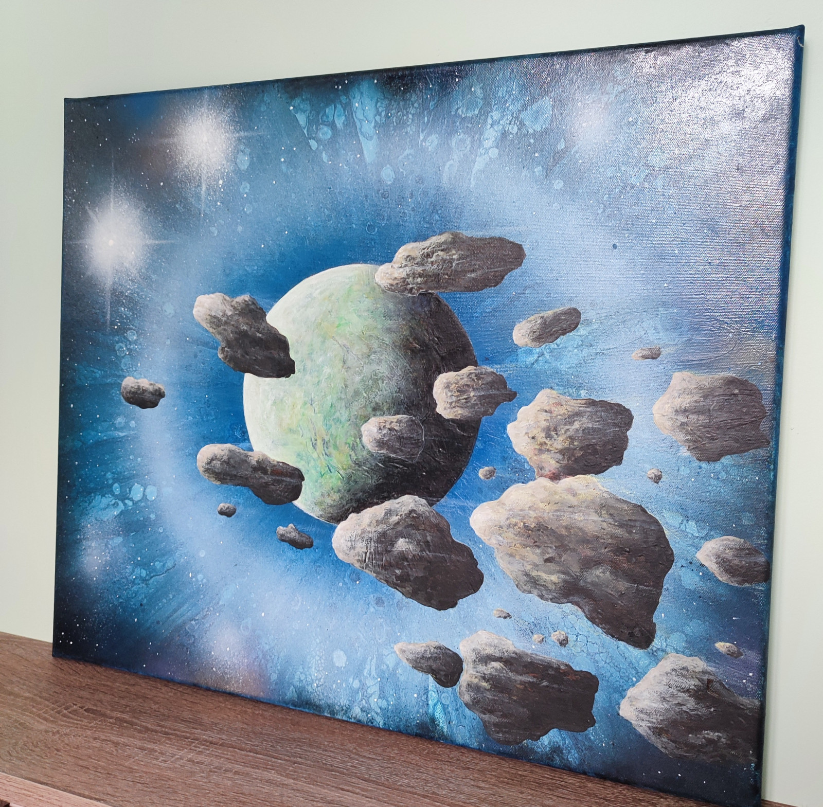 Obraz akrylowy przedstawiający asteroidy lecące w kierunku planety