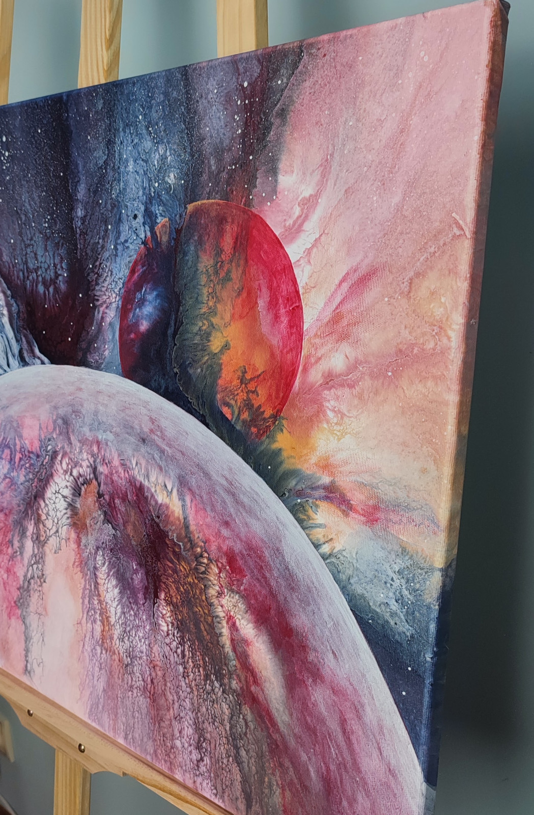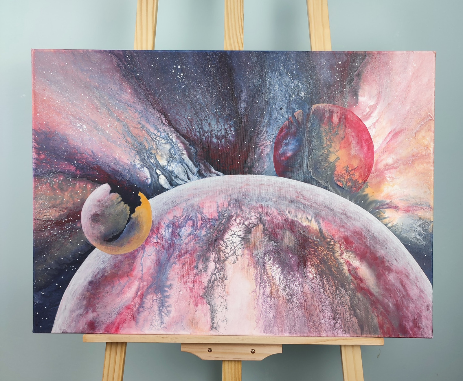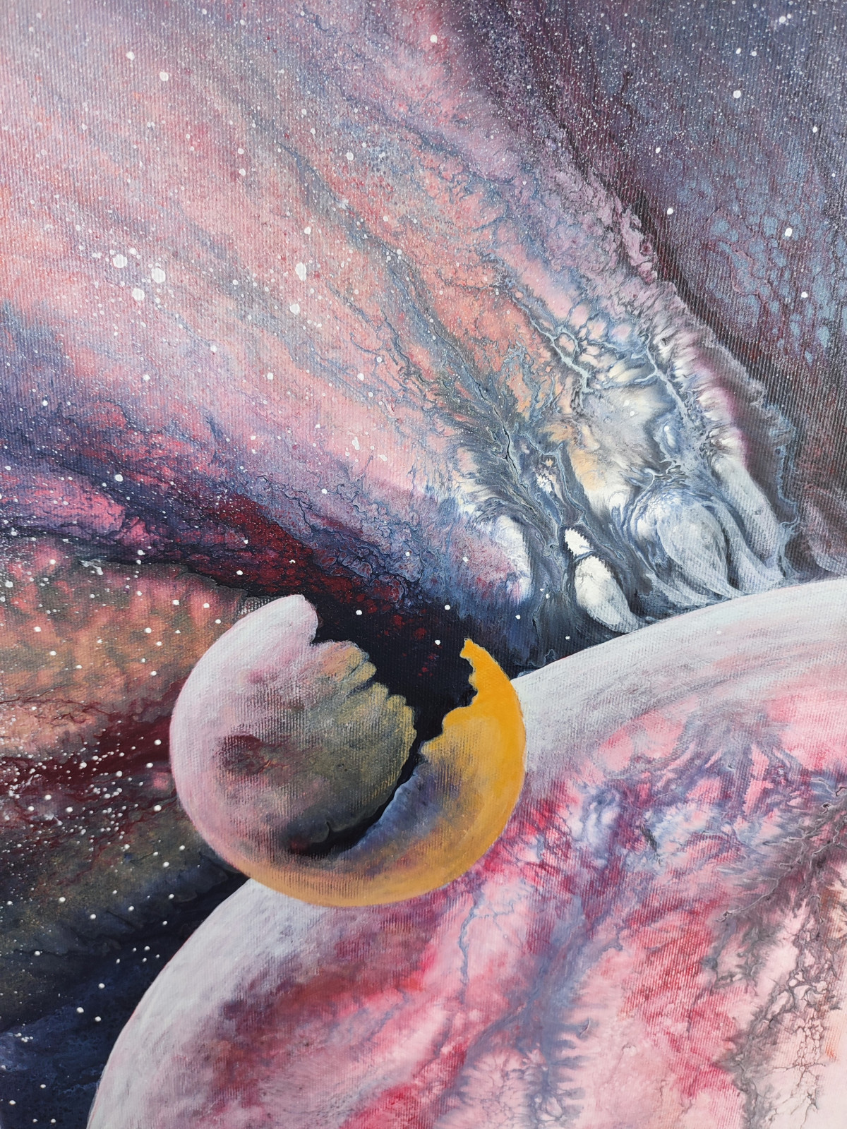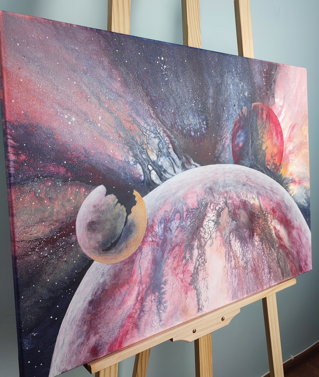 Abstrakcyjna wizja kosmosu wykonana metodą pouringu – galaktyczne struktury, planety i eksplozja barw.