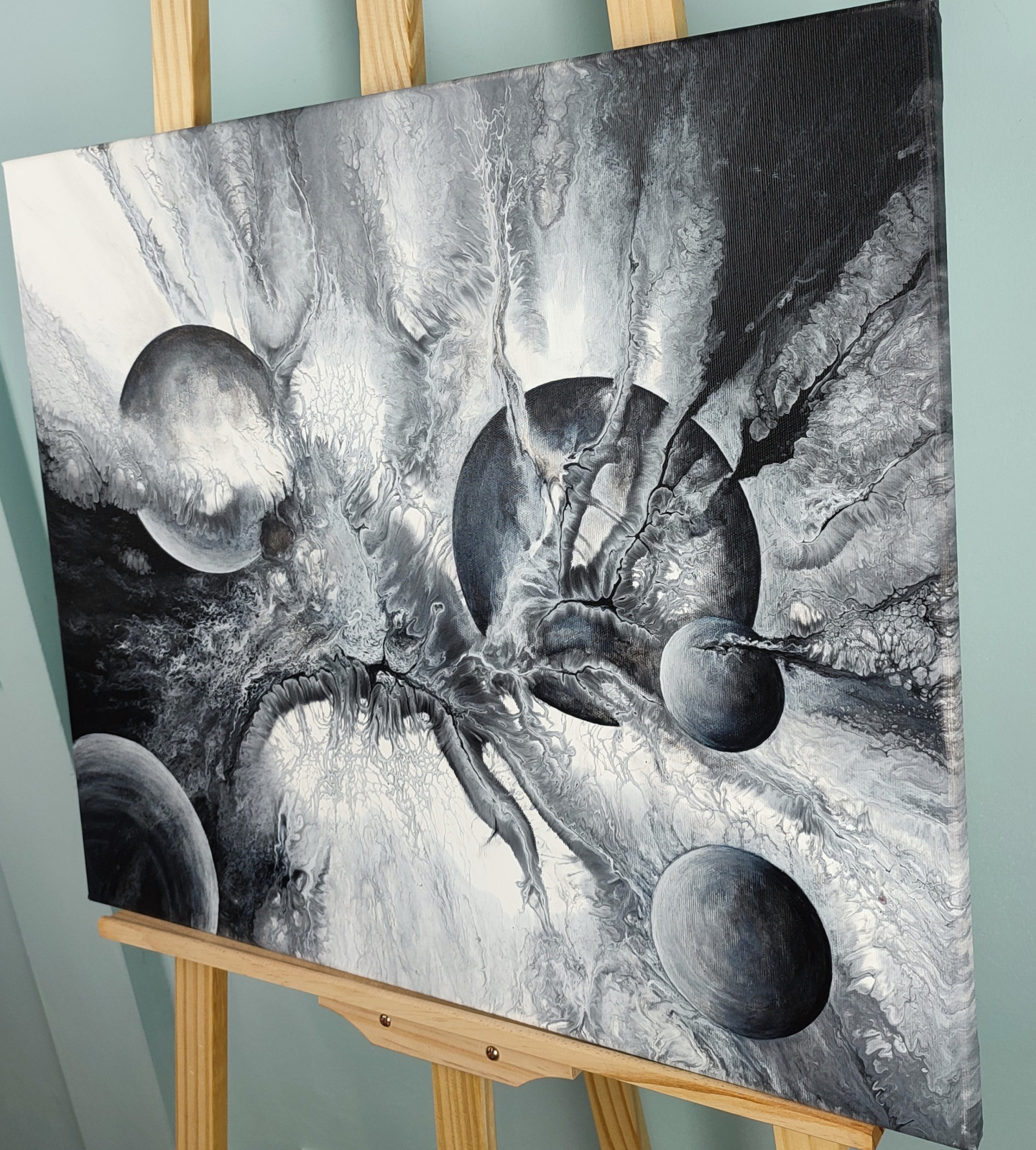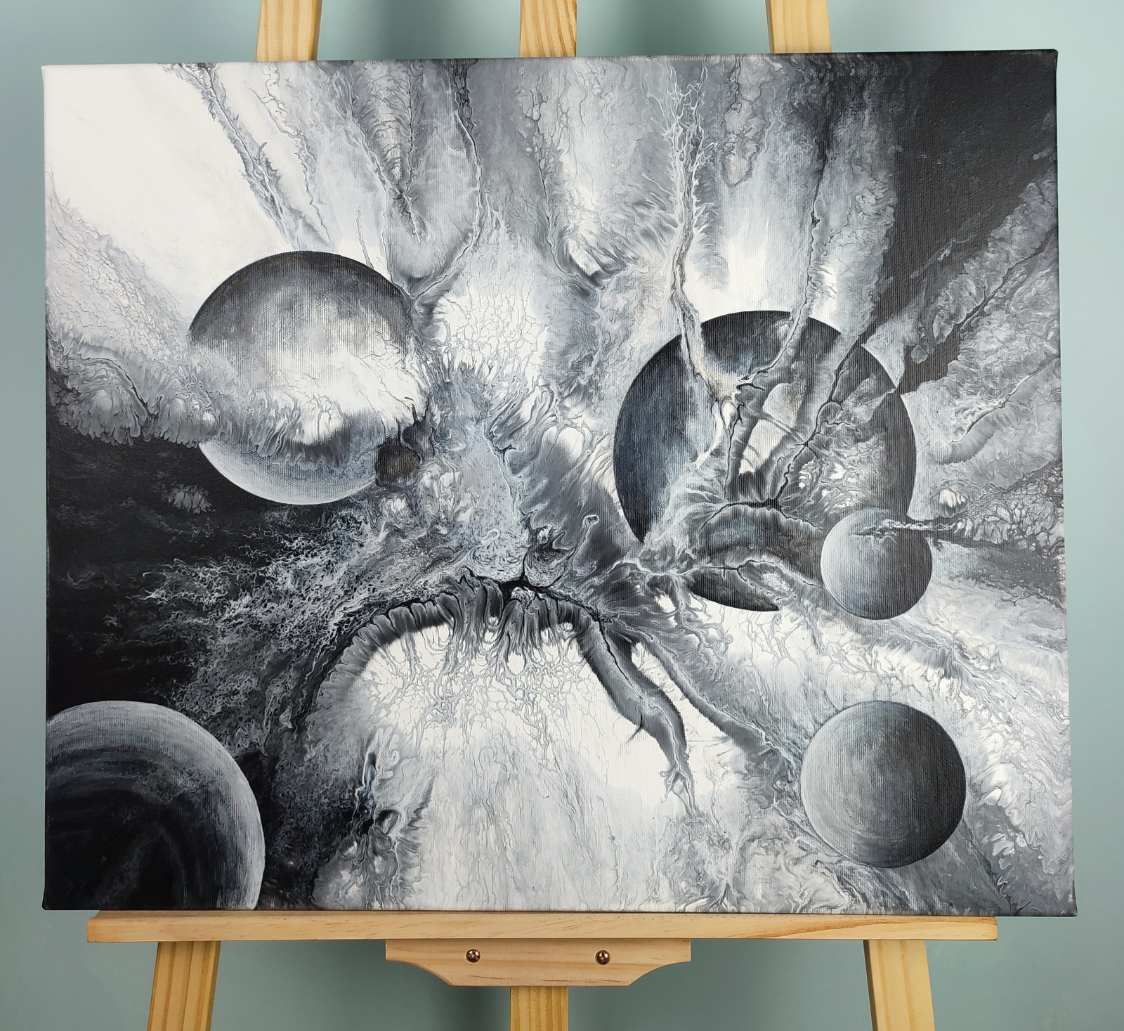 Technika: akryl. Metoda pouringu - unikalna kompozycja, której nie da się ponownie odtworzyć.