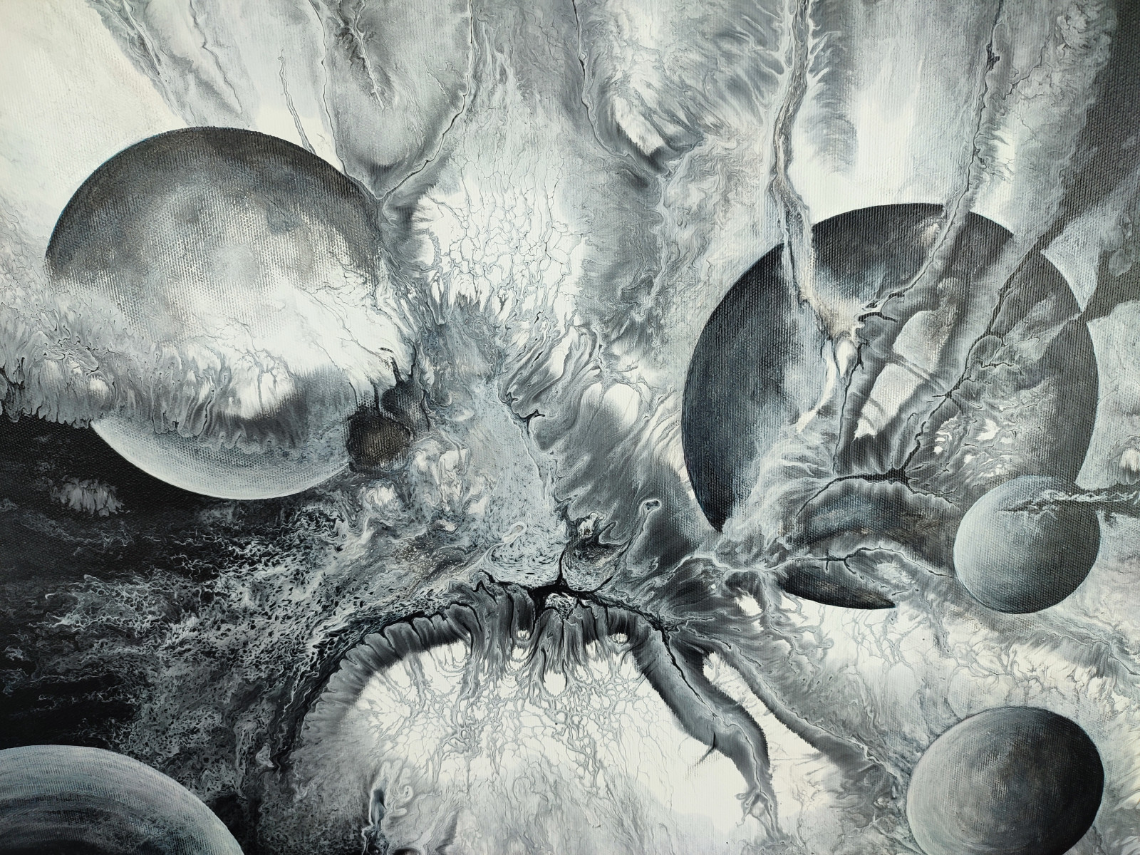 Czarno-biała abstrakcja z motywem kosmicznym.