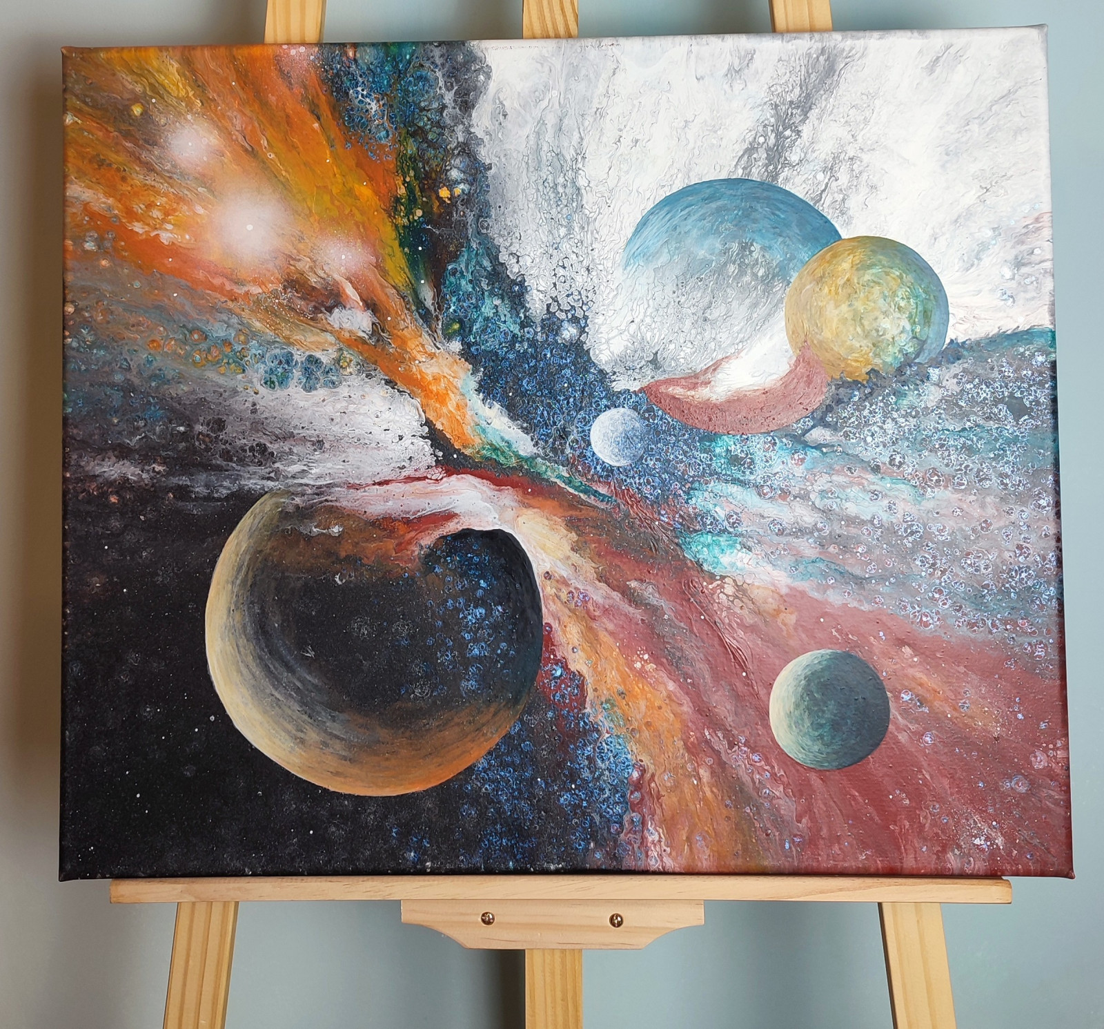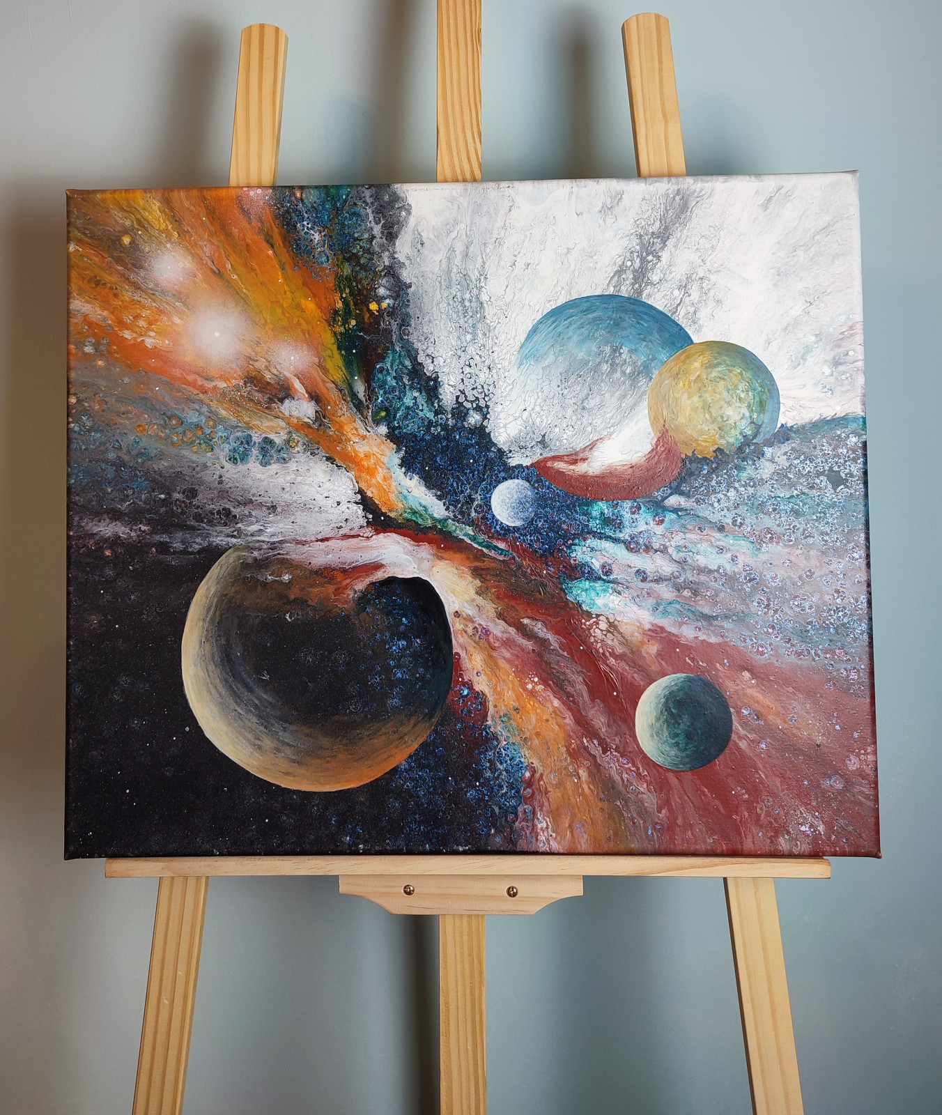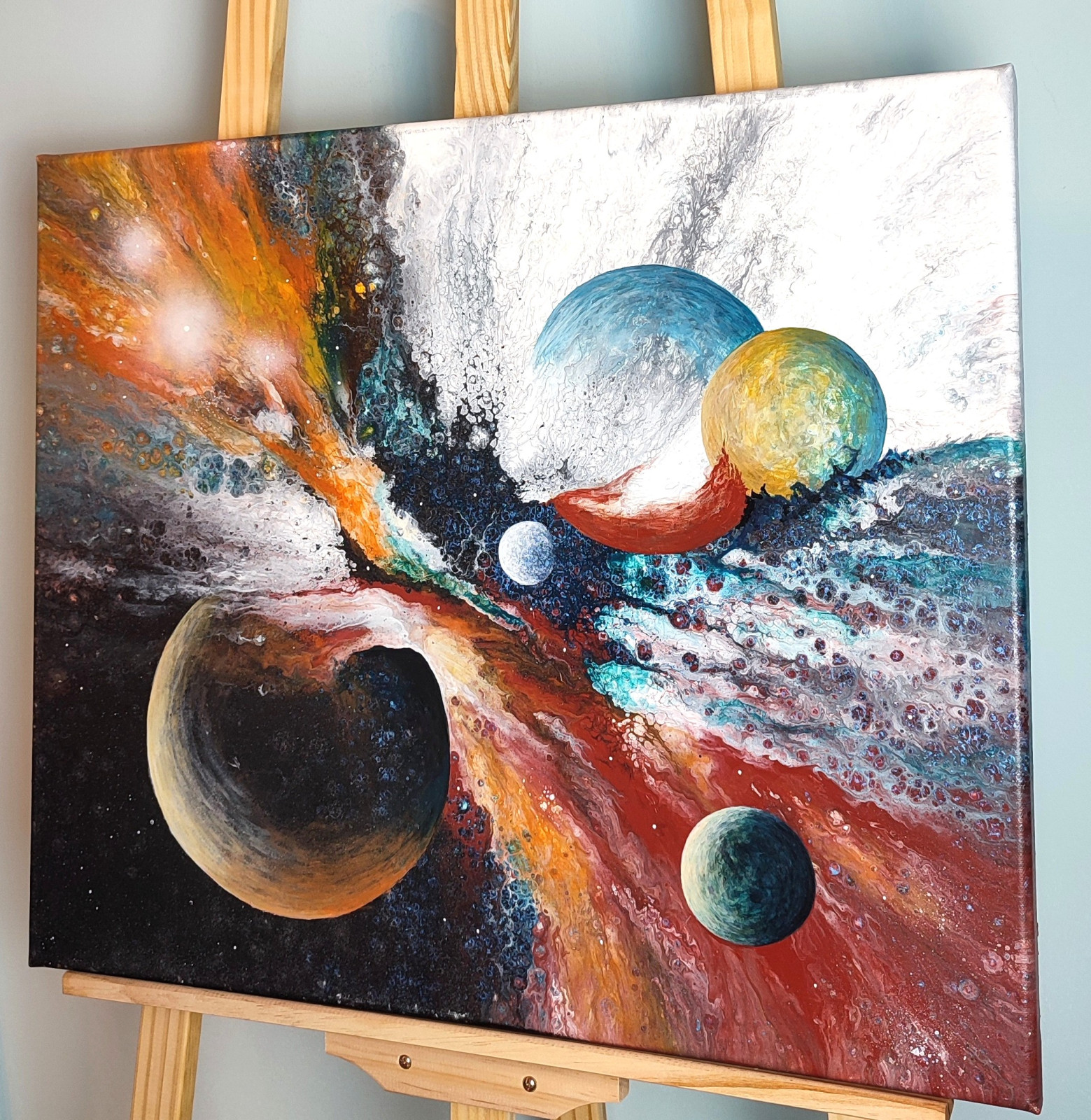Technika: akryl. Metoda pouringu - unikalna kompozycja, której nie da się ponownie odtworzyć.