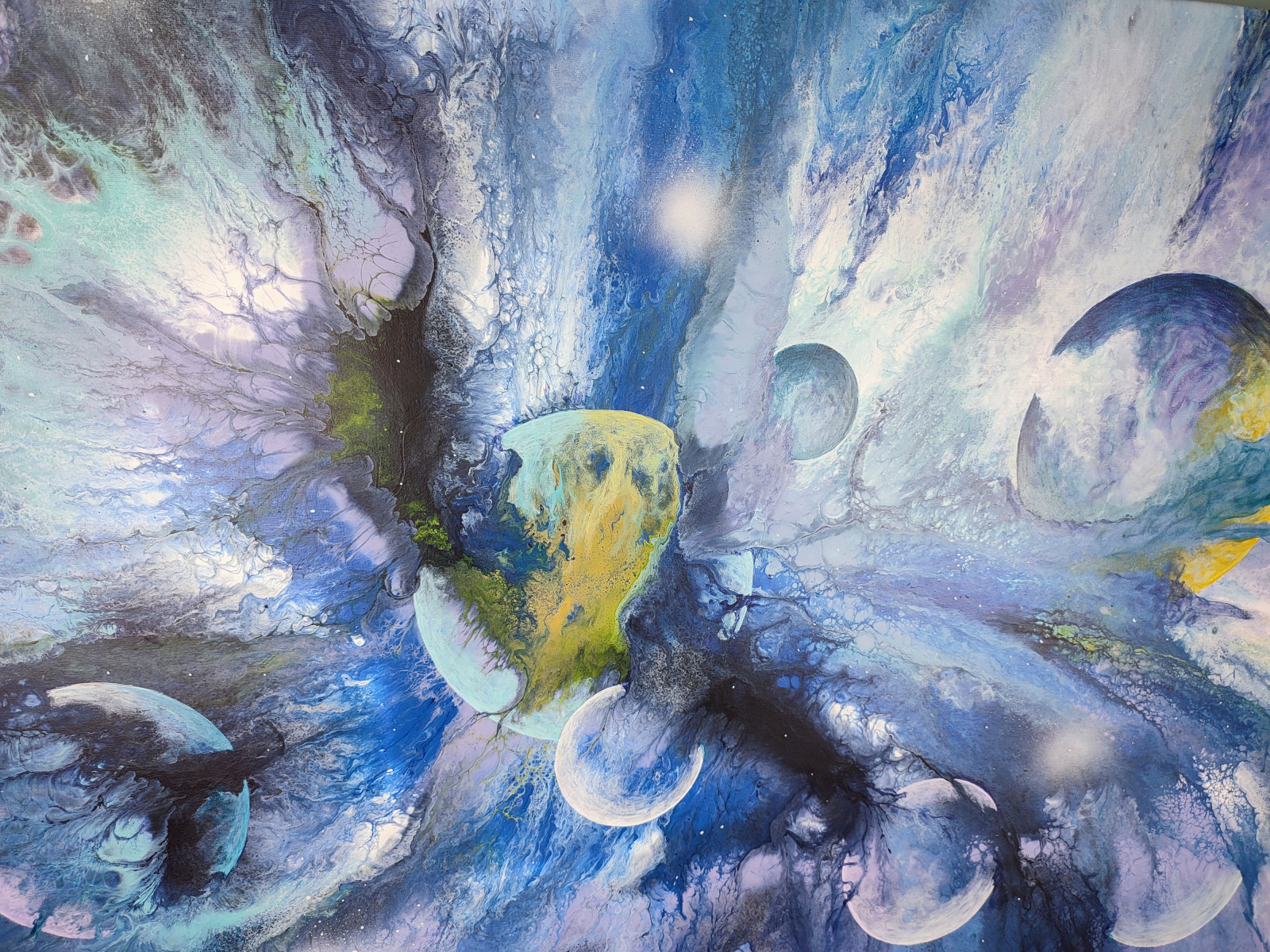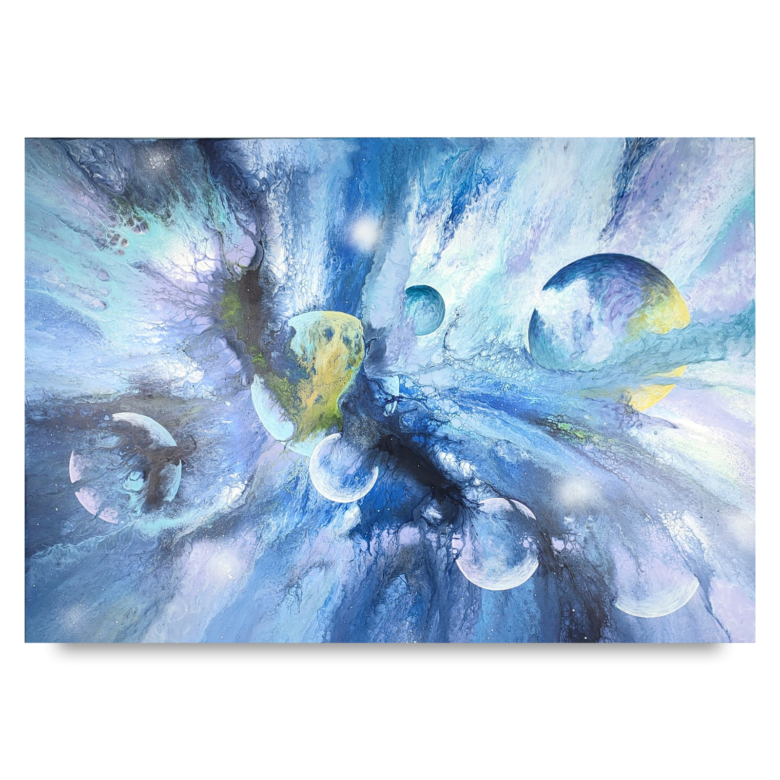 Kosmiczna Eksplozja” - Energetyczny obraz inspirowany galaktyką, pełen ruchu, światła i planet unoszących się w przestrzeni.
