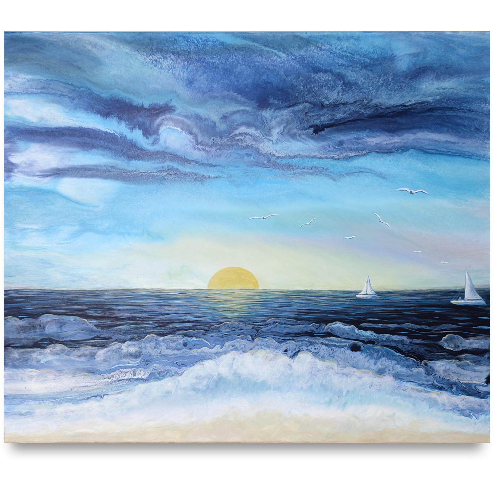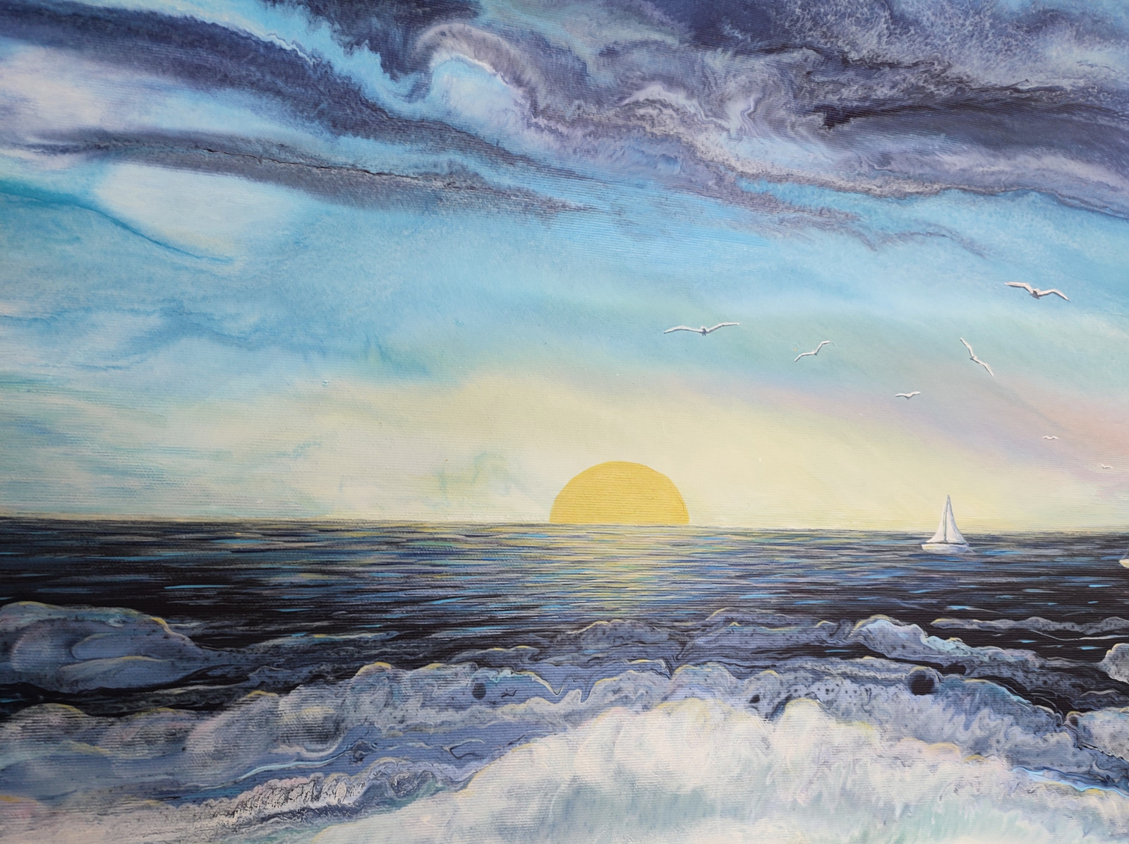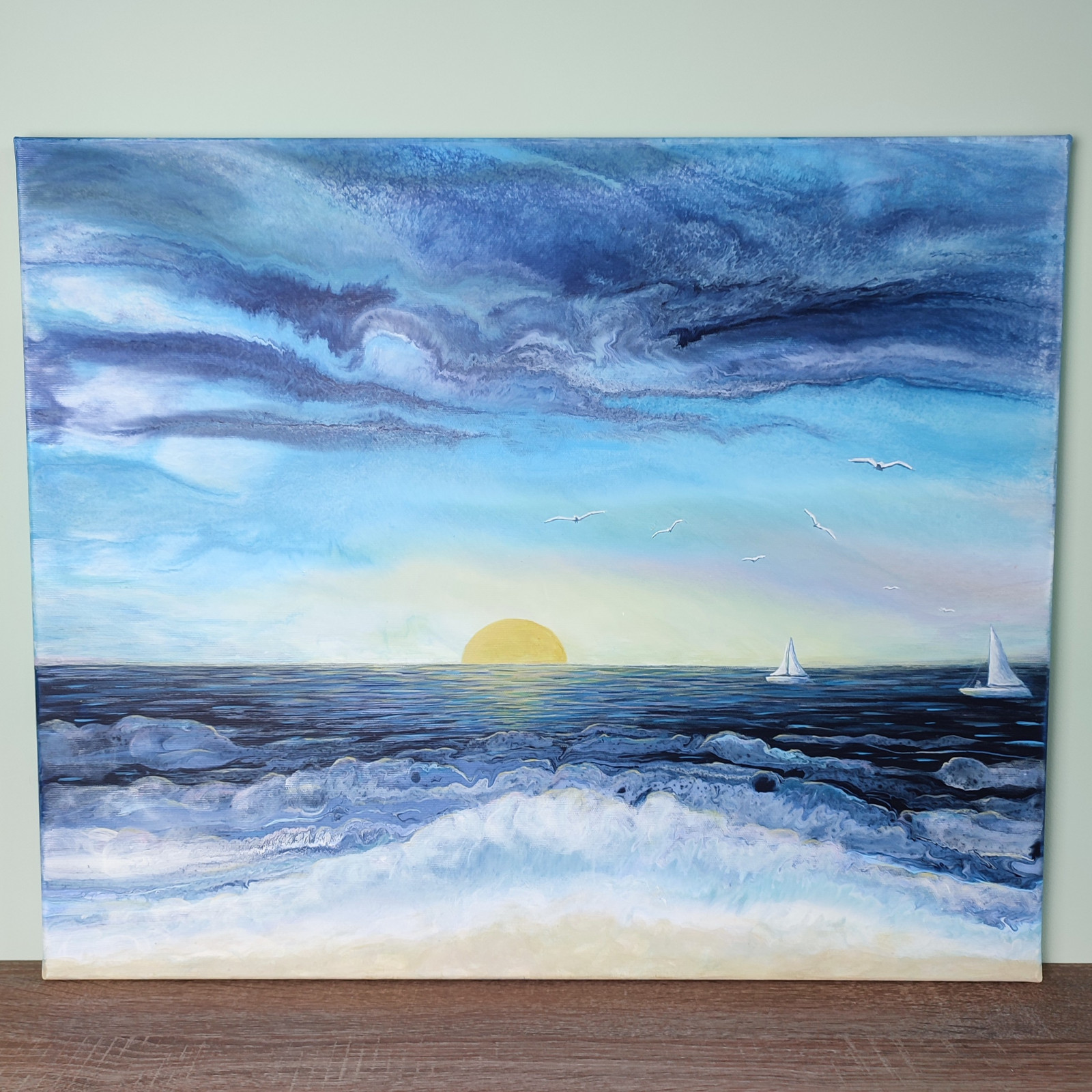 Technika: akryl. Metoda pouringu - unikalna kompozycja, której nie da się ponownie odtworzyć. Dodatkowo elementy i szczegóły domalowane pędzlem.