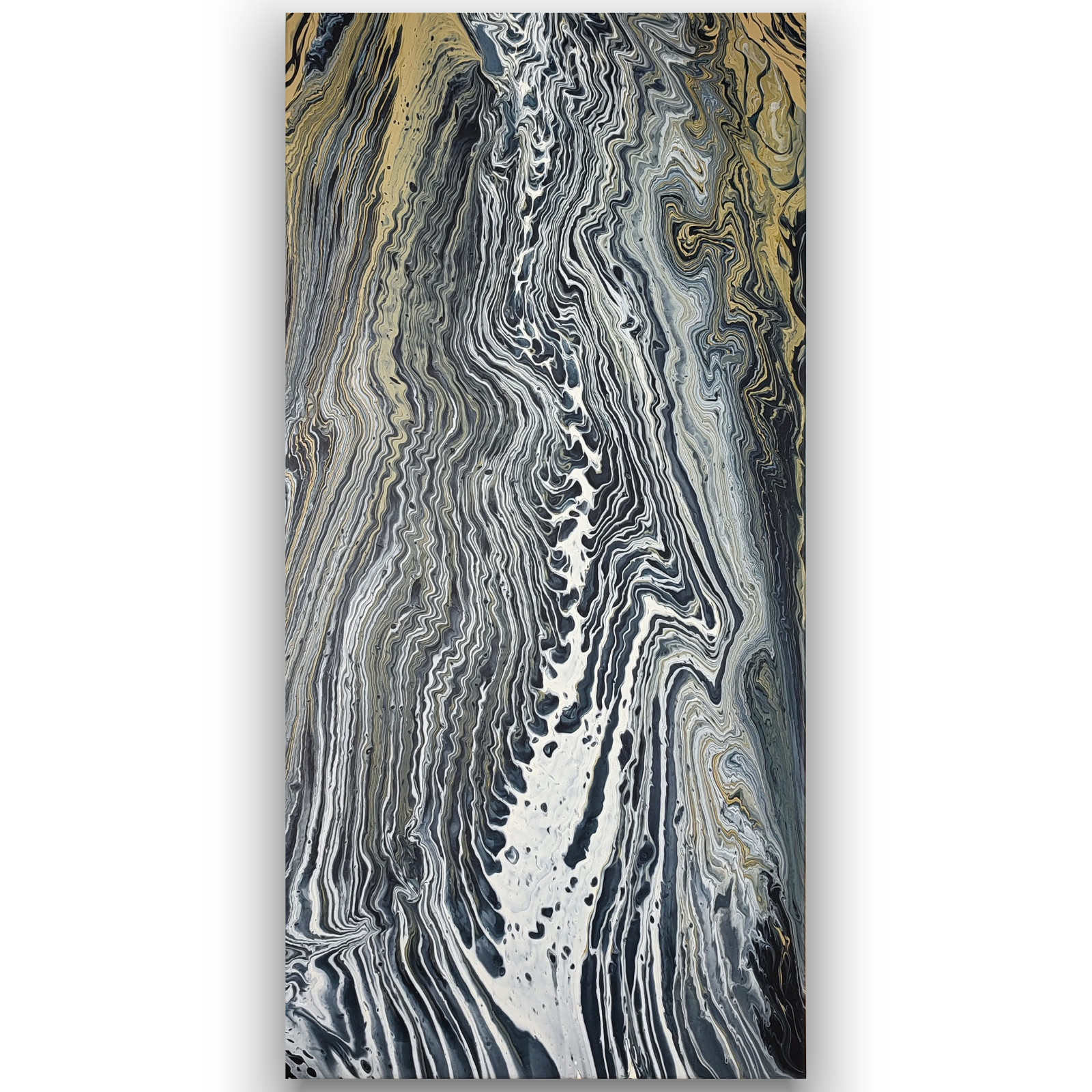 Przepływ to dynamiczna abstrakcja w odcieniach czerni, bieli i złota. Strukturalne linie tworzą efekt głębi i ruchu.