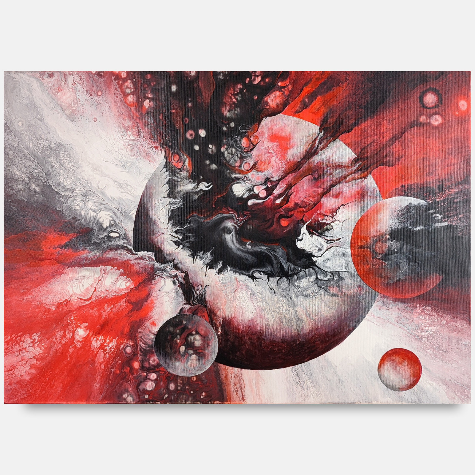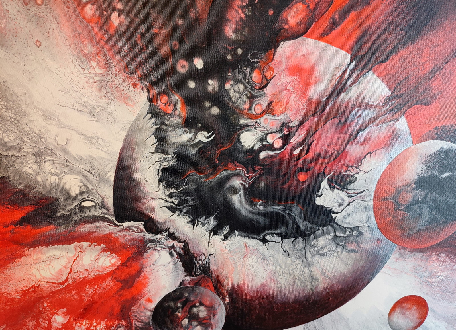 Abstrakcyjna kompozycja inspirowana kosmosem, ukazująca moment eksplozji energii przypominającej kosmiczne zderzenie.