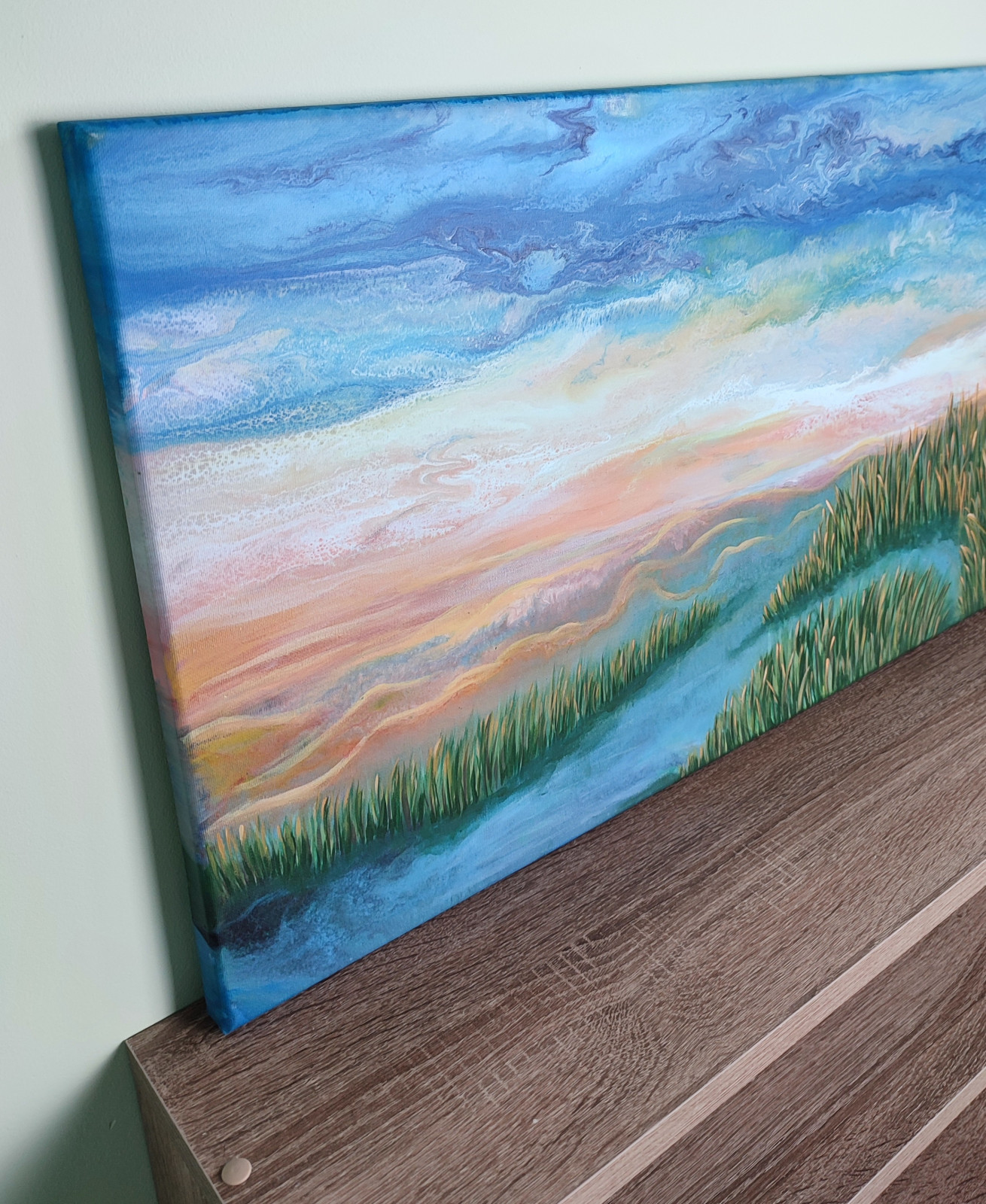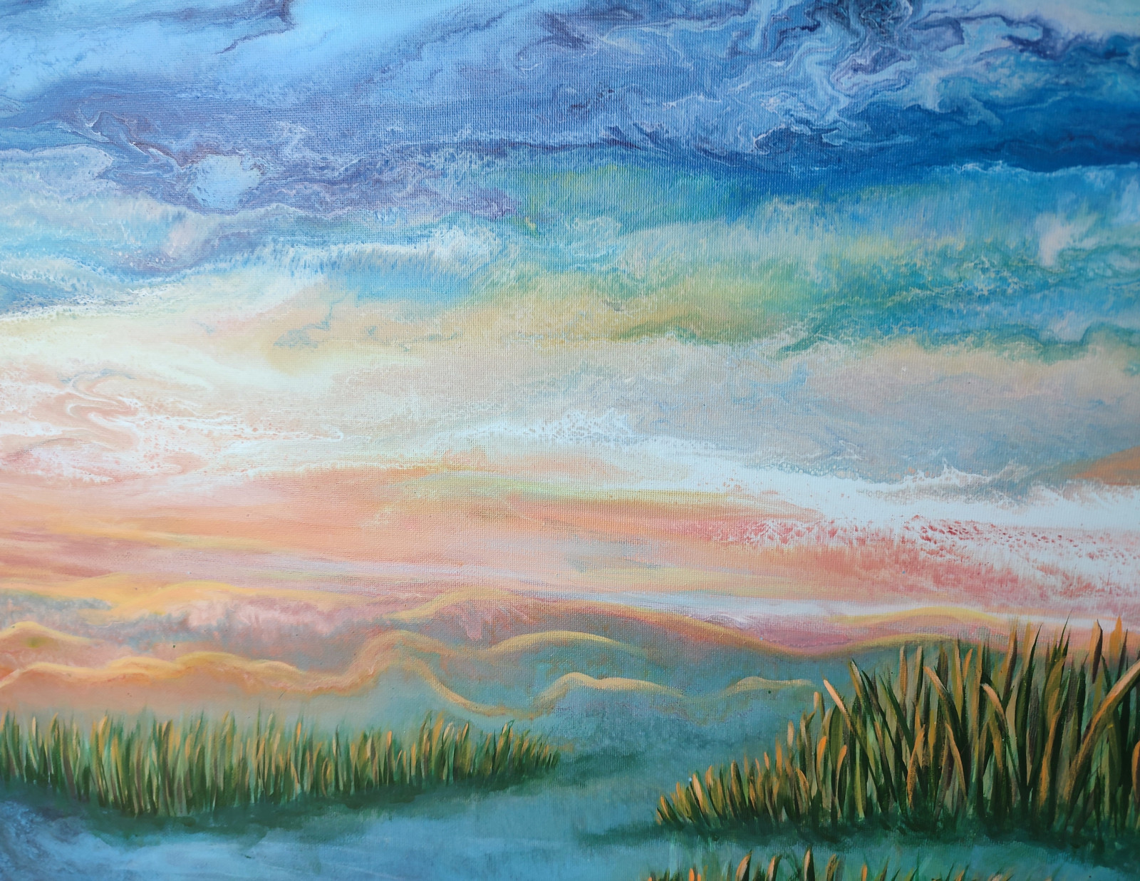 Technika: akryl. Metoda pouringu - unikalna kompozycja, której nie da się ponownie odtworzyć. Plus malarstwo tradycyjne - przy użyciu pędzla.
