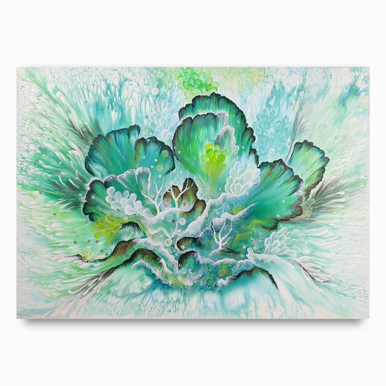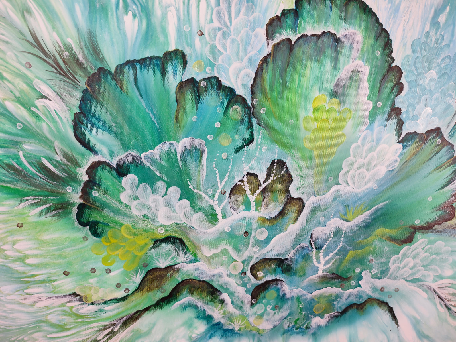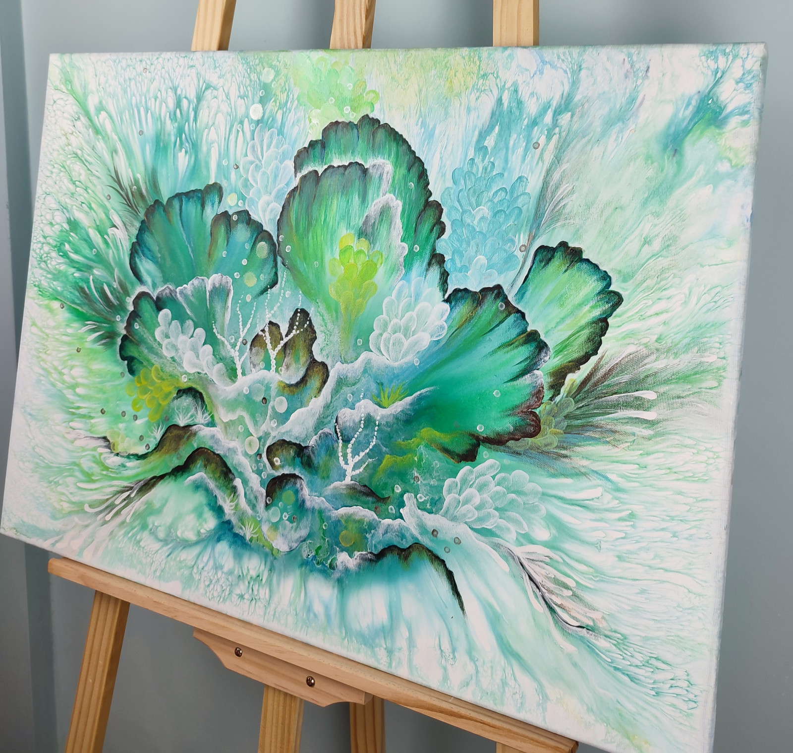 Szmaragdowy Rozkwit to abstrakcyjny obraz inspirowany światem podwodnym i rafą koralową
