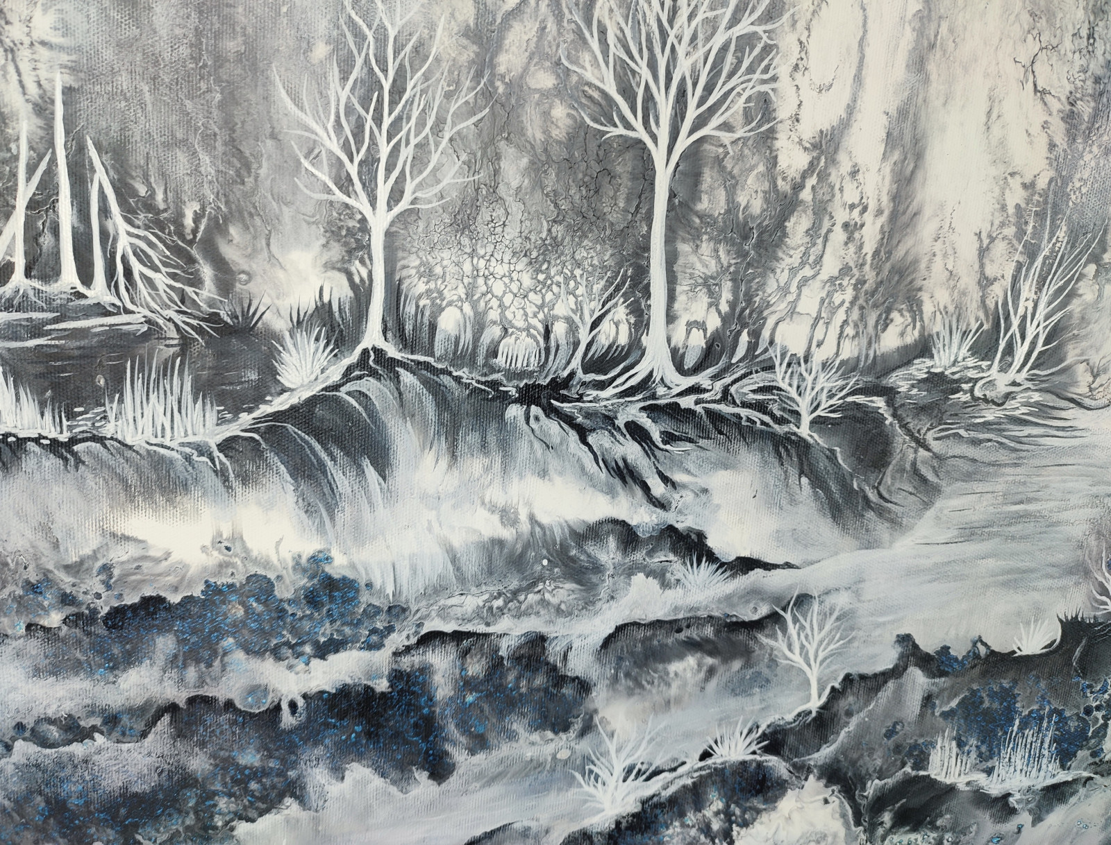 Tajemnica Lasu - Mglisty, zimowy las z rzeką, wodospadem, w czerni, bieli i szarościach z delikatnym niebieskim akcentem
