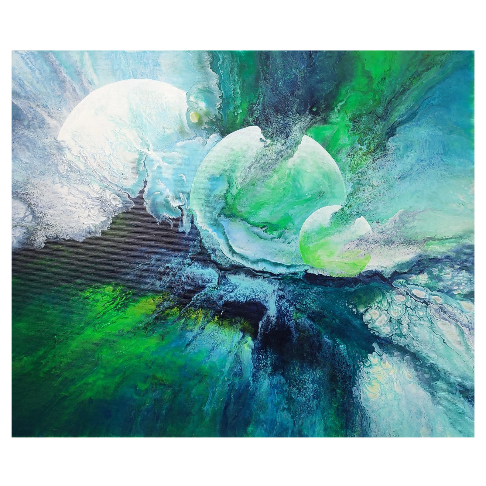 Obraz przedstawiający ruchy wody z akcentami mocnej zieleni.
