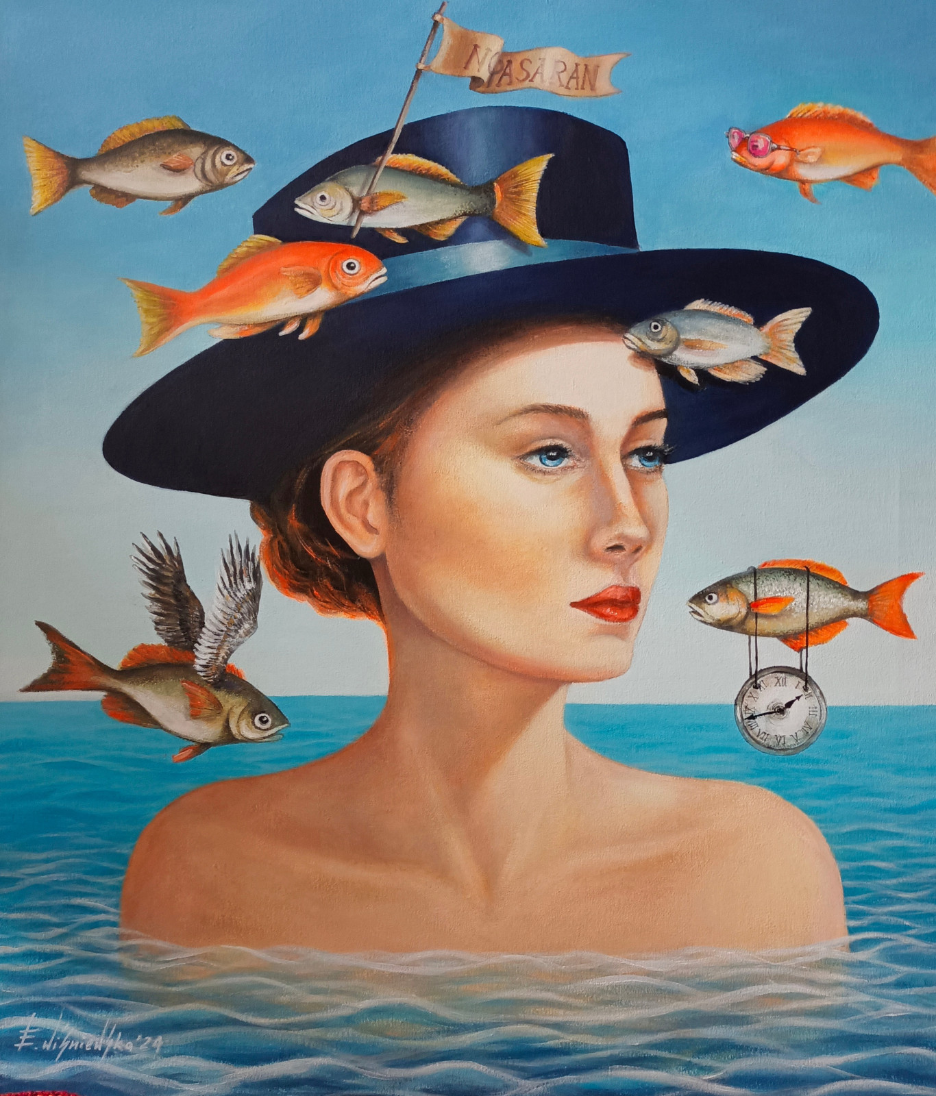 Surrealistyczny obraz malowany farbami akrylowymi na płótnie o wym. 70/60cm. Boki zamalowane, sygnatura na awersie, zabezpieczony werniksem anty-UV. Obraz posiada autorski certyfikat autentyczności.