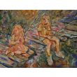 Młodzi zwykle tracą czas, nie wiedzą jak krótkie jest życie. Cykl - dwoje na kładce, dziewczyna i chłopiec, a w ustach i pomiędzy nimi, na deskach - śliwki, krosna klinowane, olej, płótno, 120x80 cm.