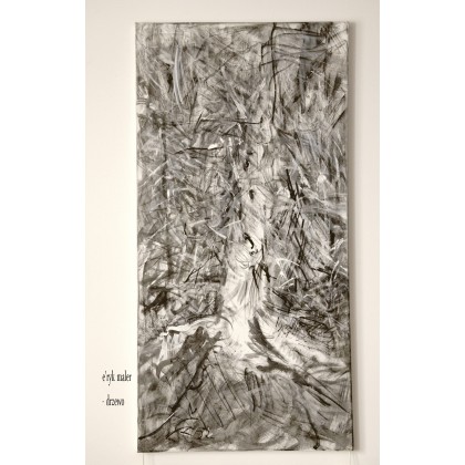 Drzewo - Las, świerki. Tusz, barwniki trwałe, czarny i biały i b. specjalne brązy - ale to nie papier, to na płótnie, 45x90 cm, drzewo w lesie, obraz wymagać będzie kiedyś oprawy, bo ma łukowate nieco - krzywe krosna, krosna są drewniane i klinowane, wyprostują się w sztywnej ramie, 2022, malunek jest zawerniksowany, (werniks retuszerski półmatowy damara), dzięki werniksowi obraz taki, a światłotrwały jest w 100%, to przetrwa i 100 lat i dużo więcej, i nie trzeba szyby