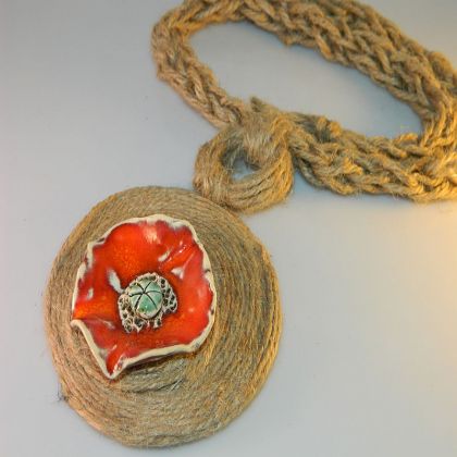 Serdecznie polecam artystyczny naszyjnik -lniany sznurek z porcelanowym kwiatkiem