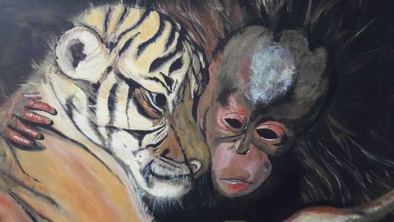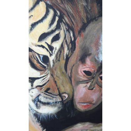 Młody tygrysek z małpką . Obraz akrylowo- olejny na płótnie. Piękna dekoracja do wnętrz., świetnie nadaje się na prezent. Obraz ręcznie malowany na płótnie naciągniętym na sosnowy blejtram.