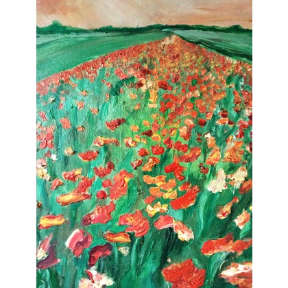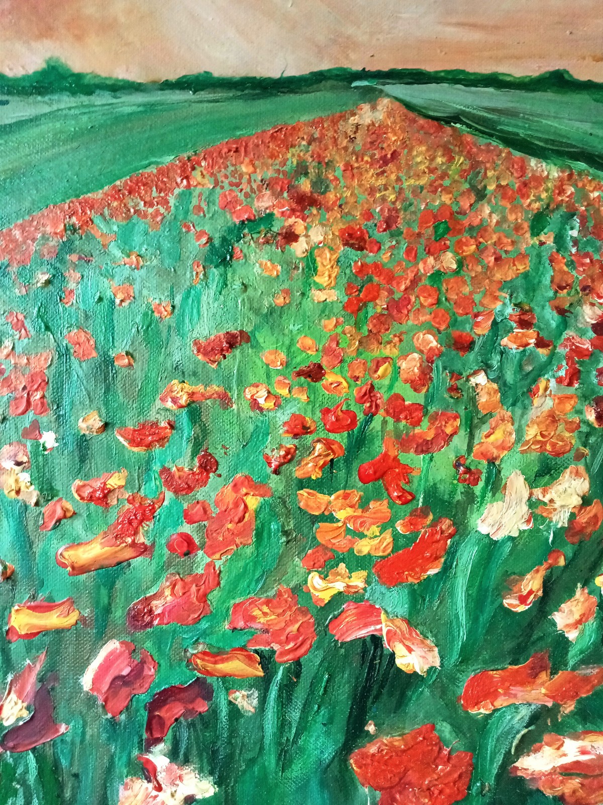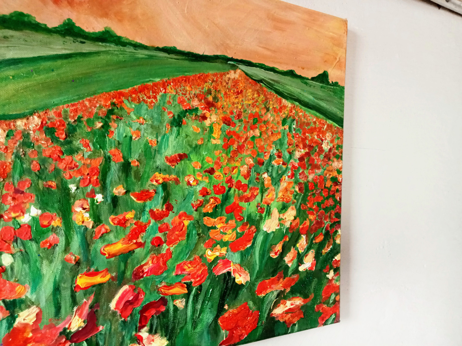 Sceneria pola maków malowana akrylem gruba warstwa.