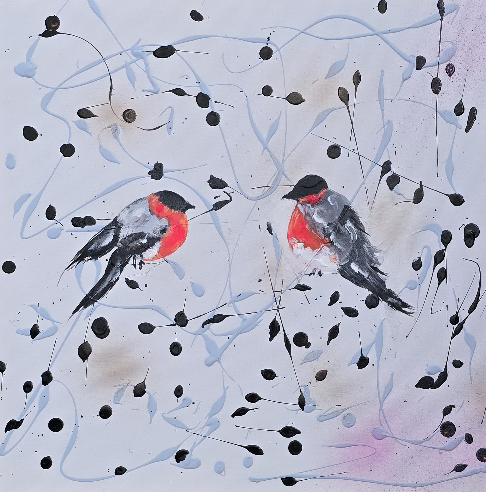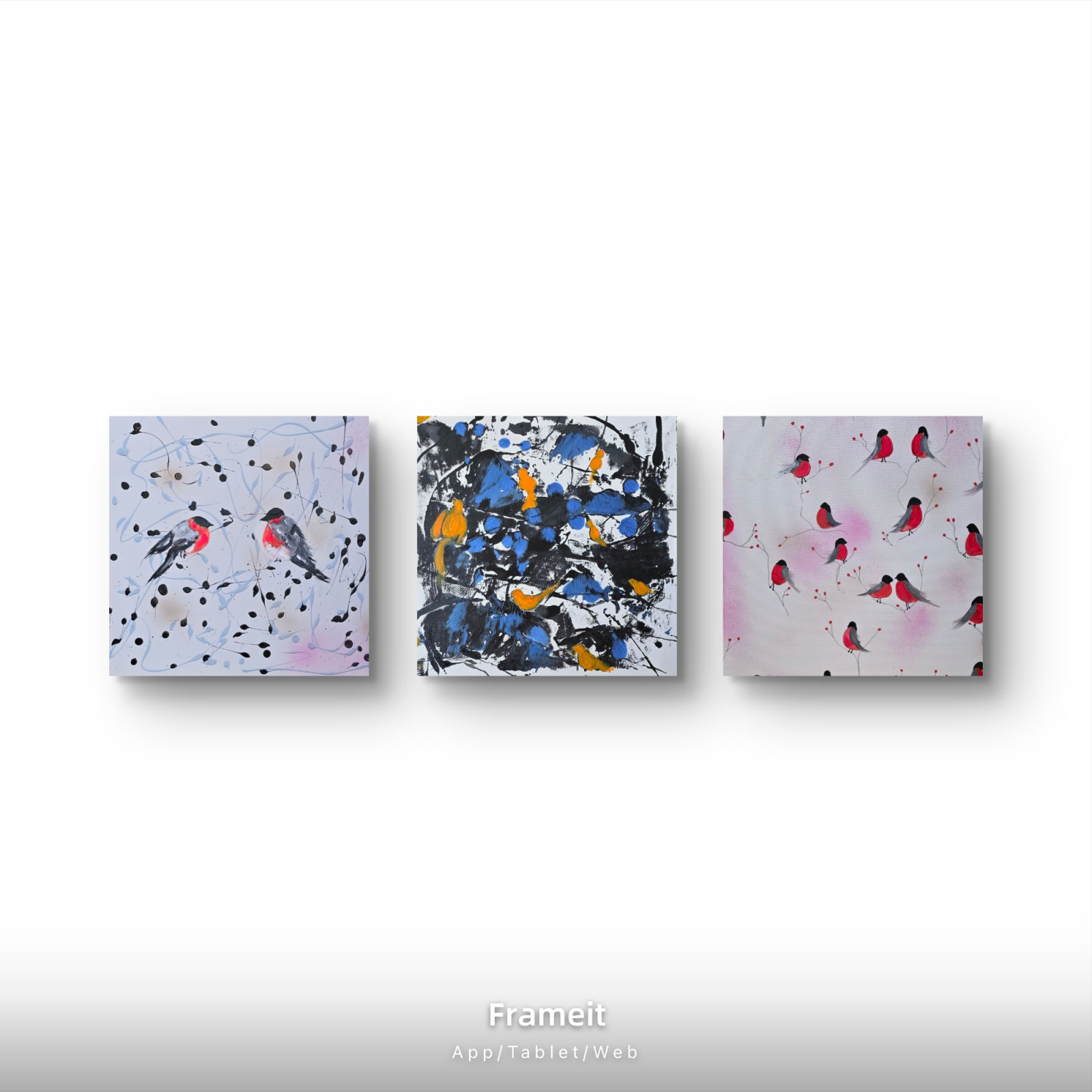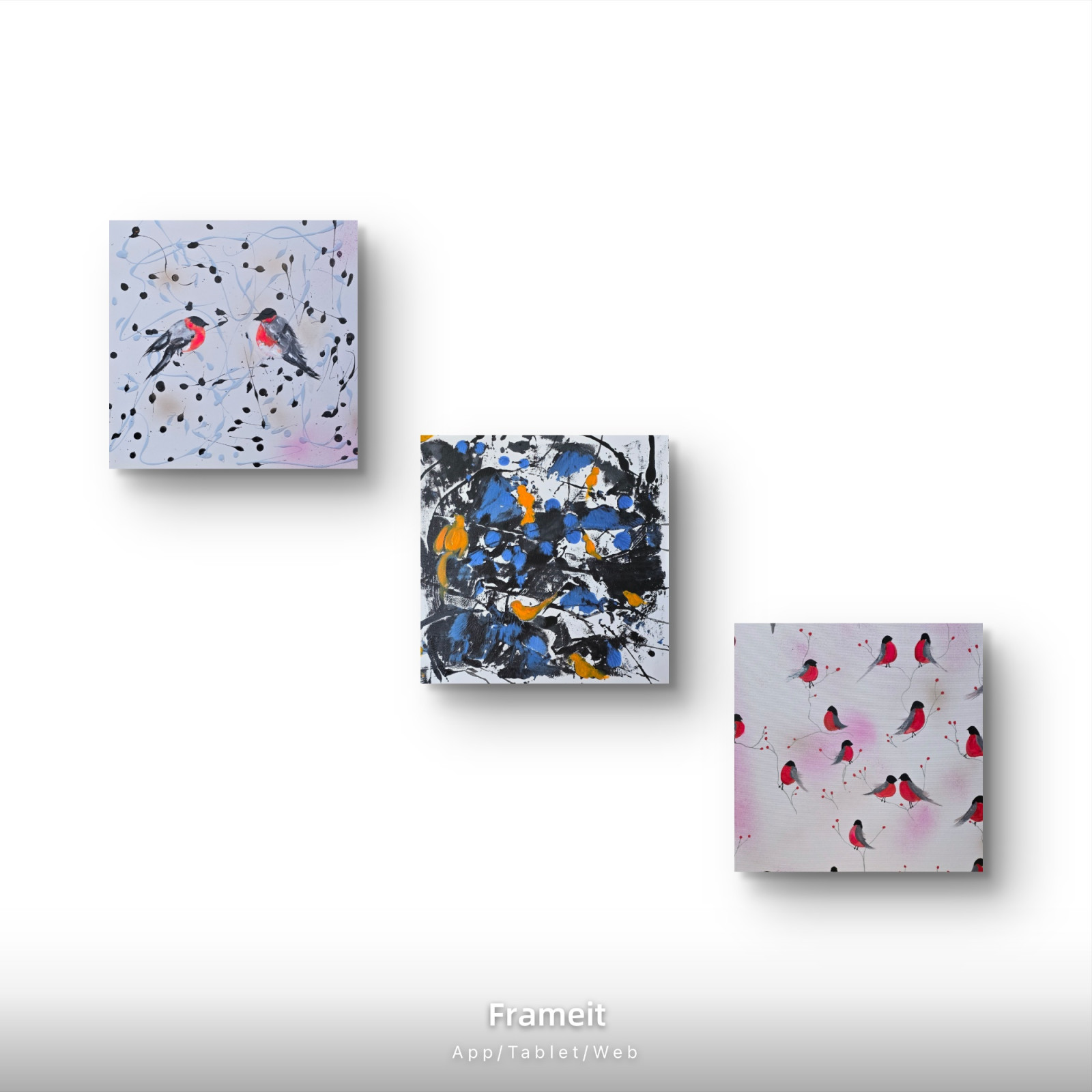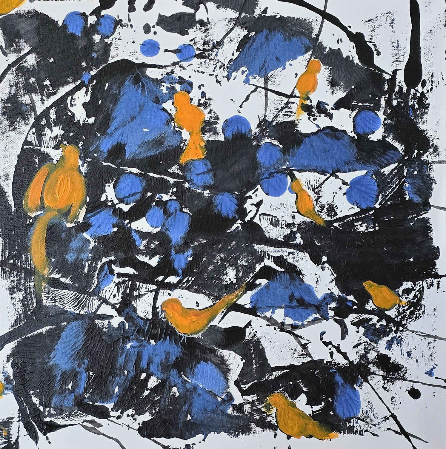 Ptaszarnia, kompozycja prac na plotnie , 50x50x1 cm