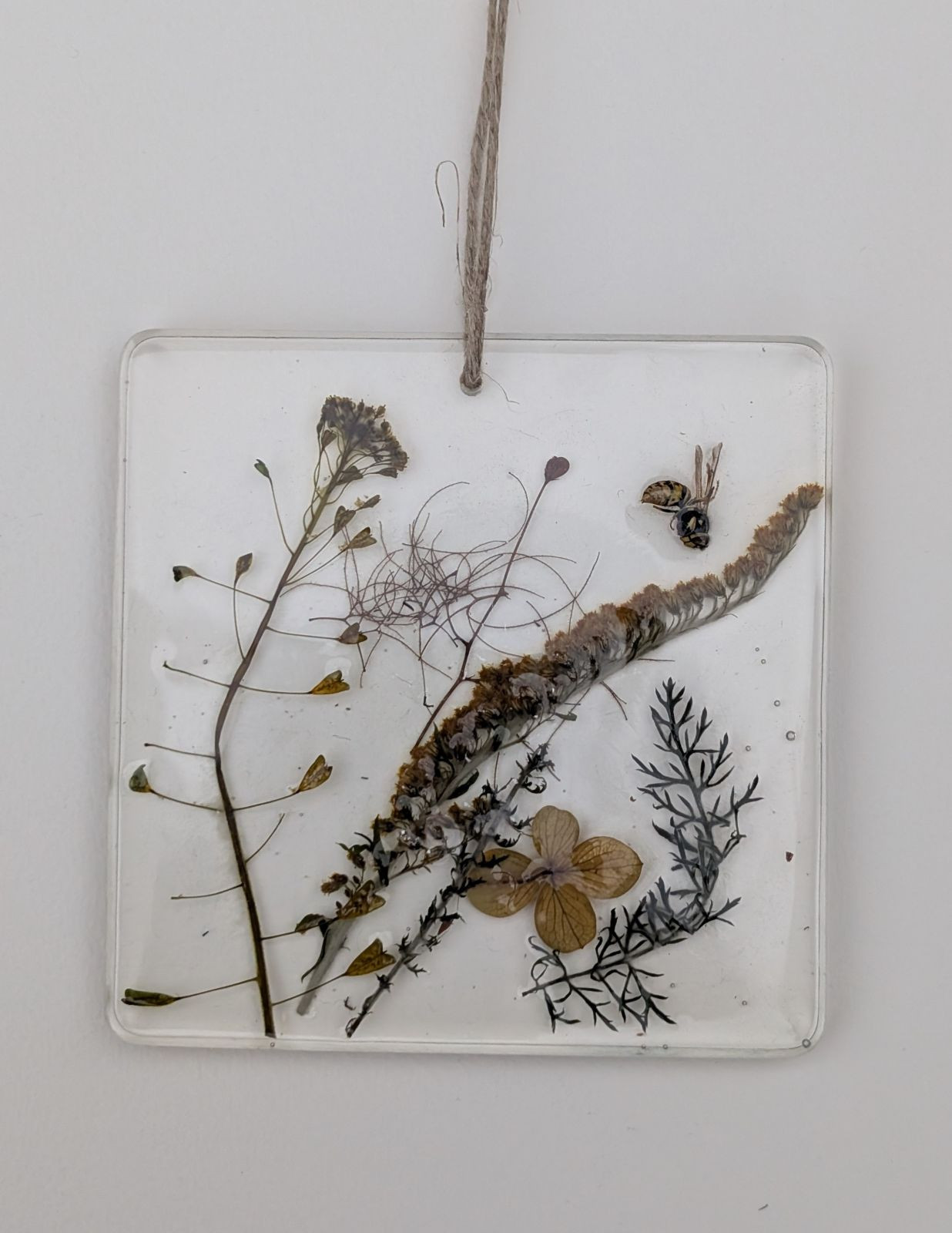 suszone rośliny, kwiaty, owady, żywica epoksydowa, sznurek lniany.