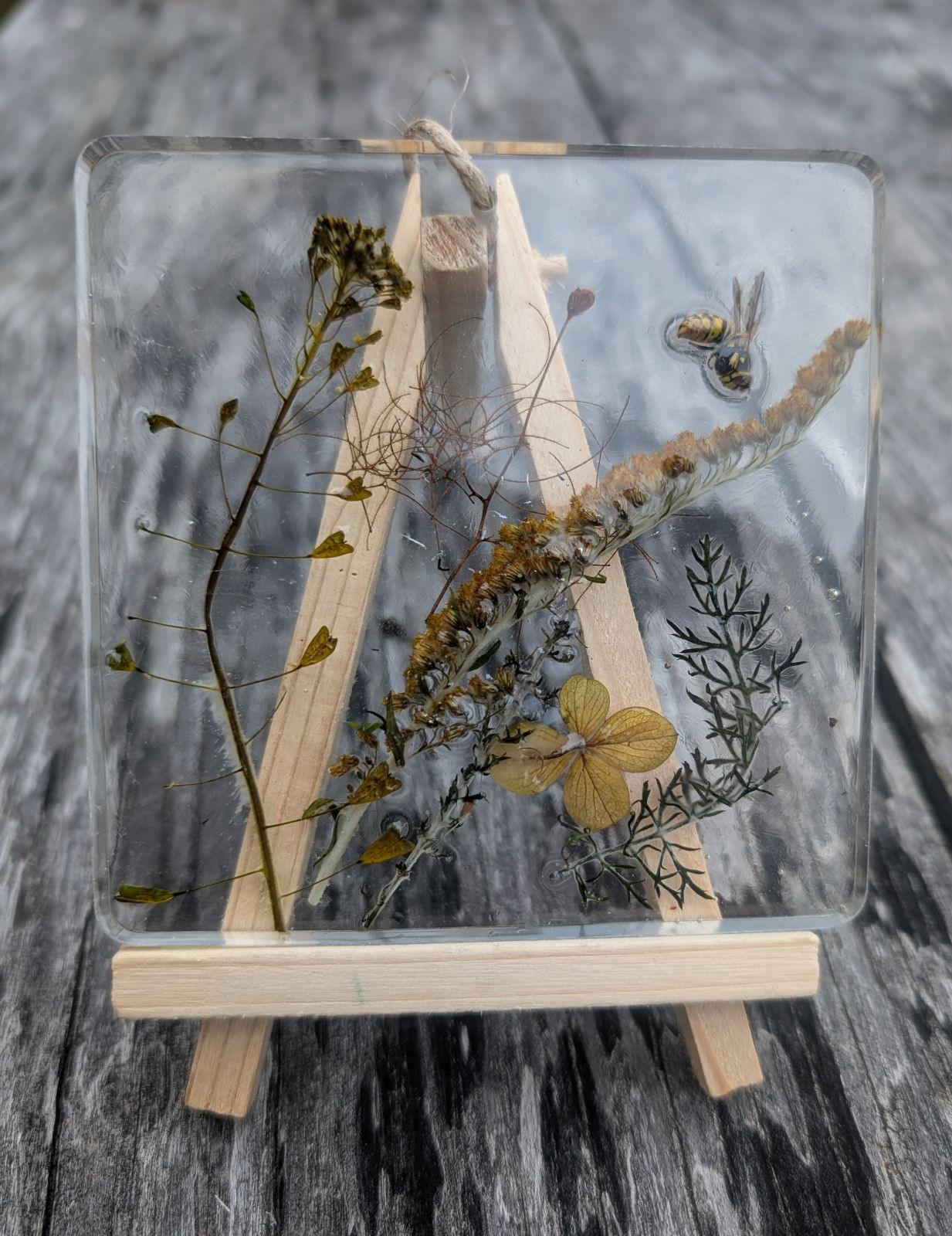 Niepowtarzalny dekor ścienny z suszonych roślin i owadów zatopionych w żywicy epoksydowej.