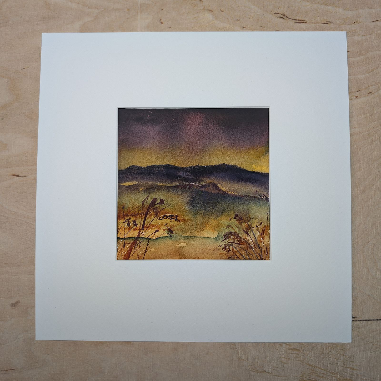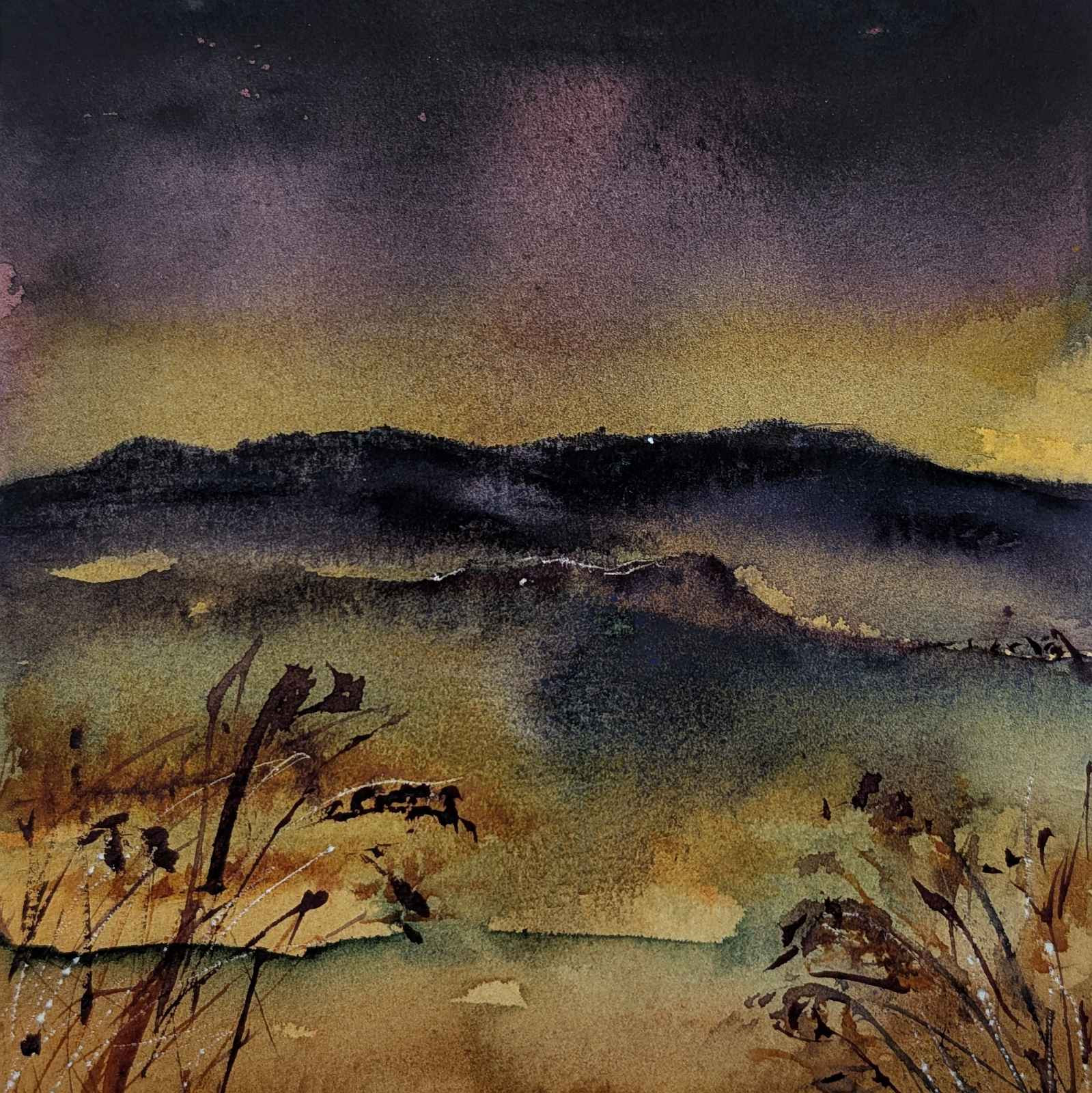 Nastrojowa, autorska akwarela przedstawiająca minimalistyczny pejzaż górski w barwach zmierzchu.