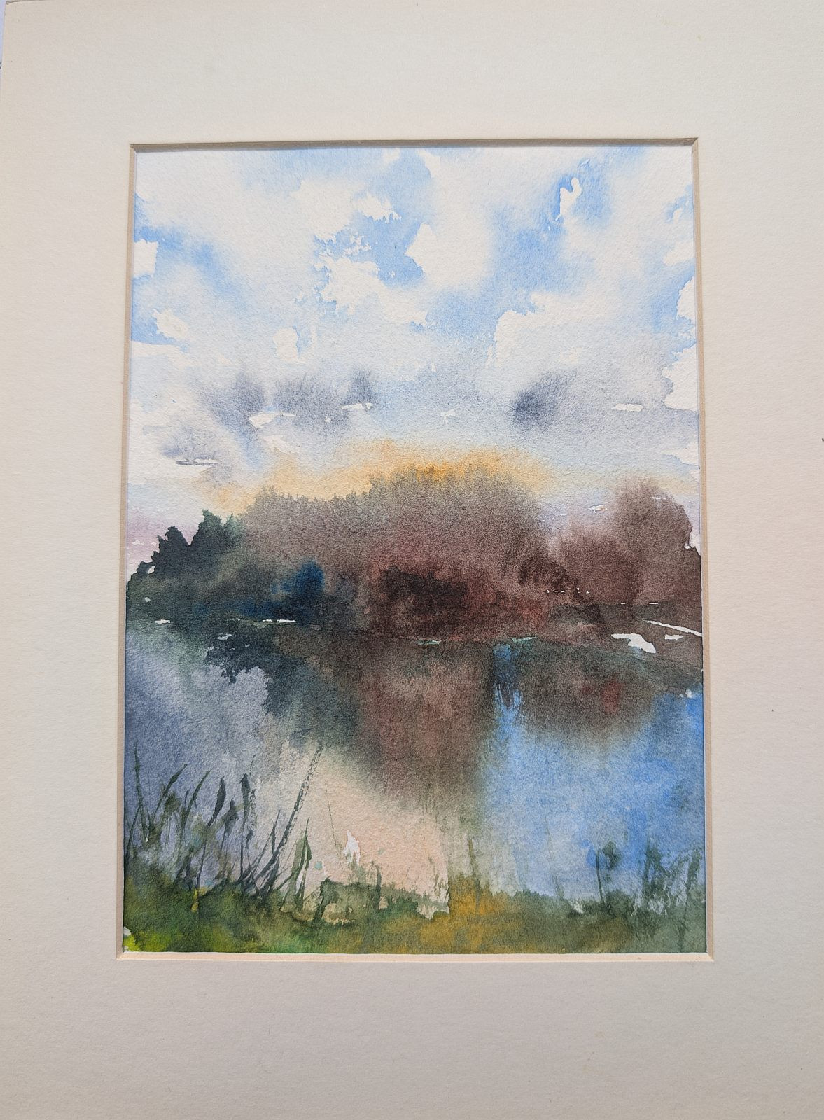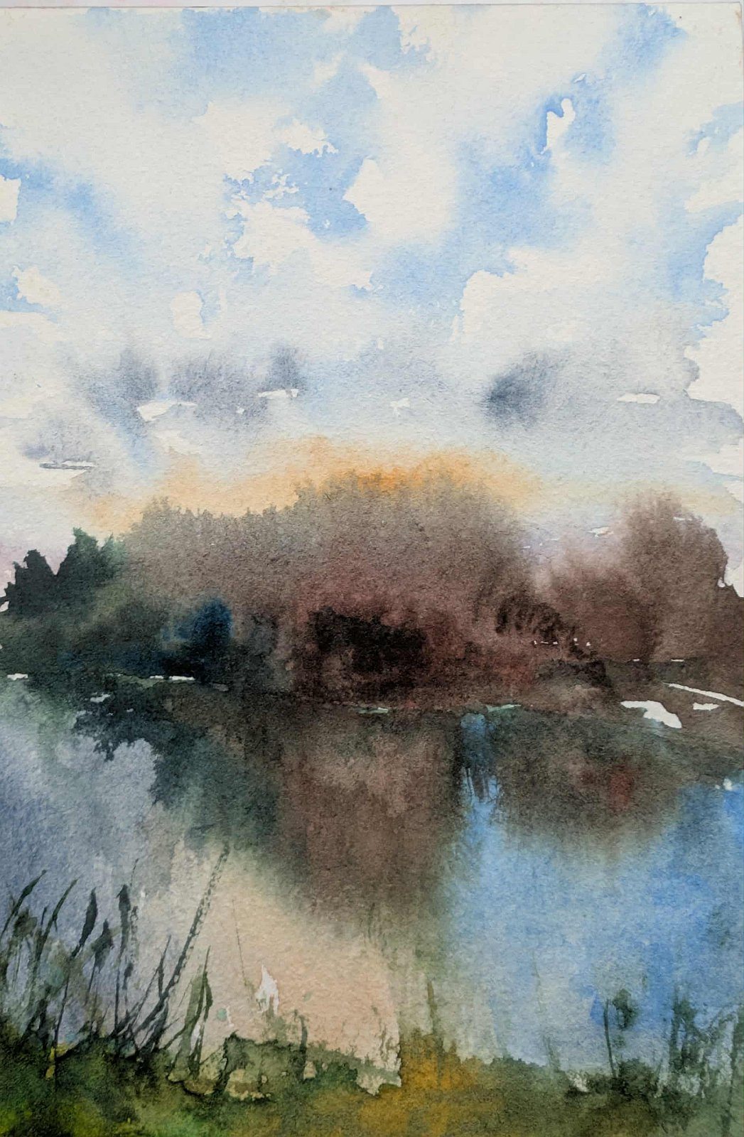 Akwarela ukazuje nastrojowy krajobraz. Na pierwszym planie widać trawiaste rośliny wynurzające się ze spokojnego jezioro, wypełnionego ciepłymi odcieniami jesieni na tle jasnego, zachmurzonego nieba.