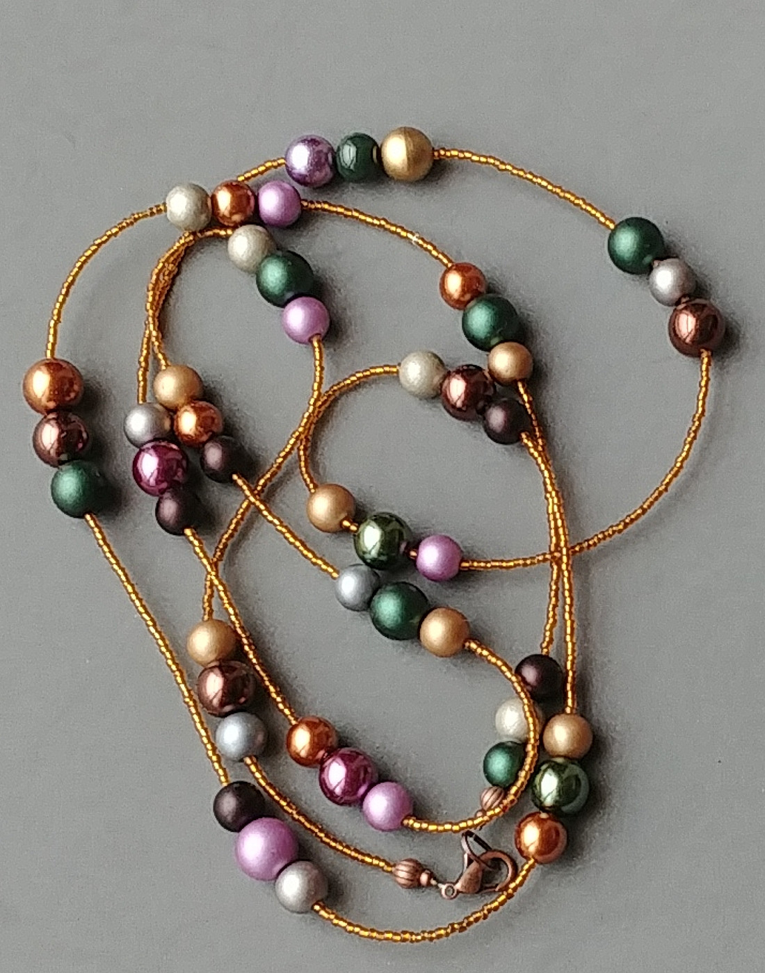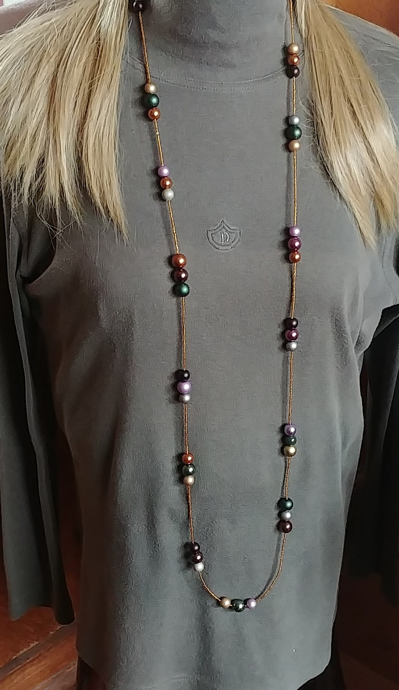 Autorska niebanalna kompozycja mixu bajecznie kolorowych szklanych pereł o różnych wymiarach i odcieniach utrzymanych w pięknych kolorach jesieni przeplecionych z dopasowanymi kolorystycznie drobniutkimi szklanymi koralikami (see beads). Powstał niezwyczajny i ogromnie efektowny, kolorystycznie niebanalny naszyjnik. Długość ok 140 cm, co pozwala dzięki zapięciu owinąć naszyjnik nawet trzykrotnie wokół szyi. Utrzymany w modnym stylu boho.