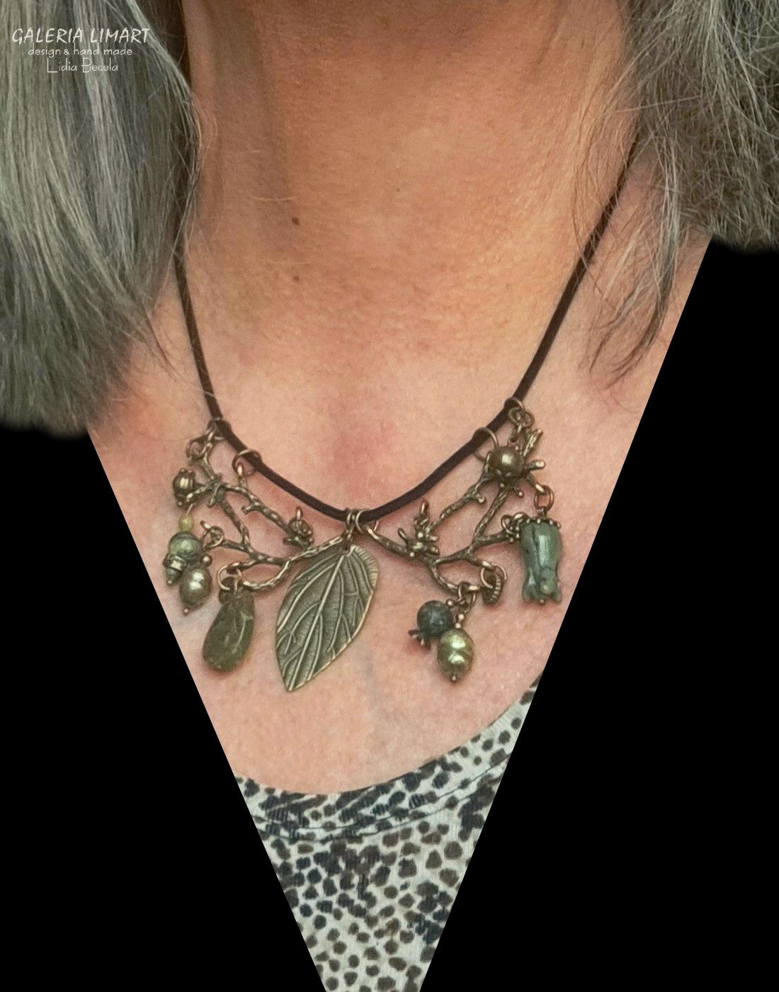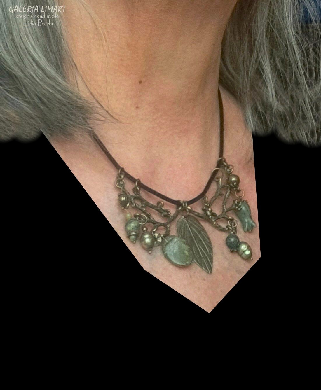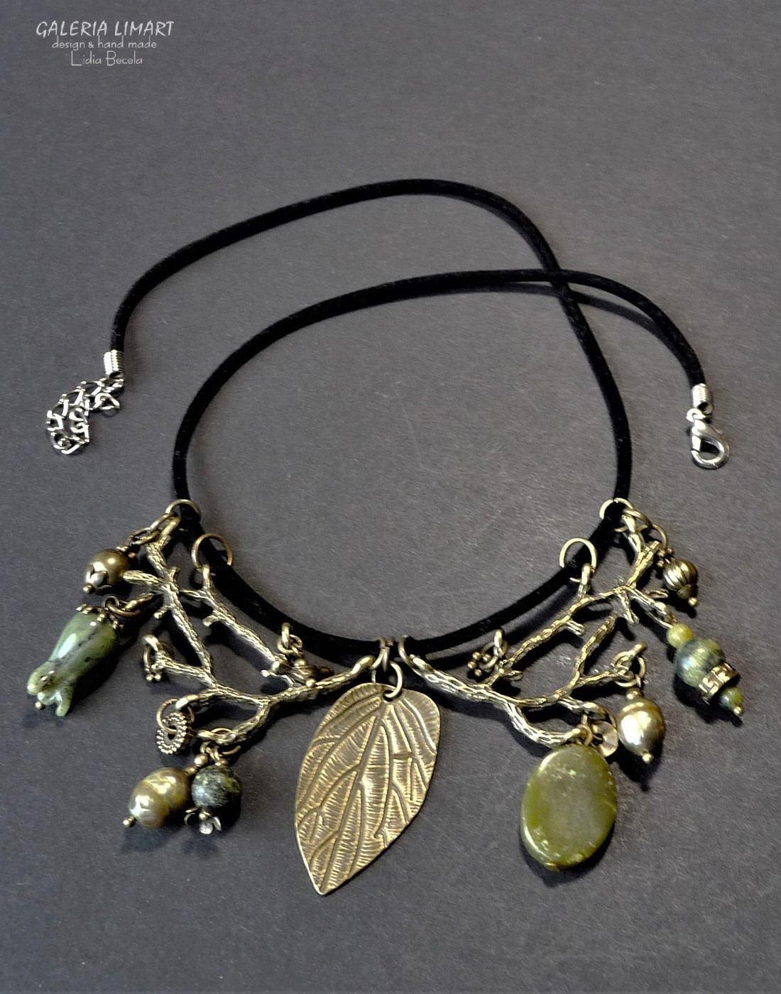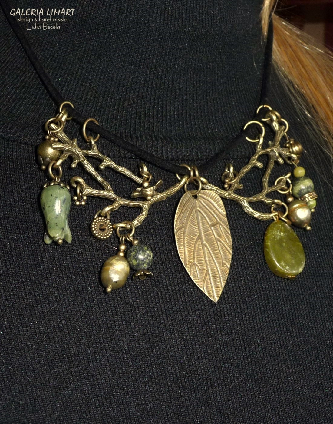 Lubisz taki styl? Jeśli tak to polecam ten uroczy eklektyczny i bardzo ozdobny, delikatny i uroczy naszyjnik z chryzoprazem i pięknymi zielonymi naturalnym perłami oraz oryginalnymi ciekawymi stylizowanymi gałązkami z mosiądzu. Wszystko utrzymane w eleganckiej starozłoto-zielonej tonacji, co dało niezwykle efektowny i spektakularny rezultat, tworząc naszyjnik w stylu dobrej starej biżuterii i modnego stylu boho. Lekki.