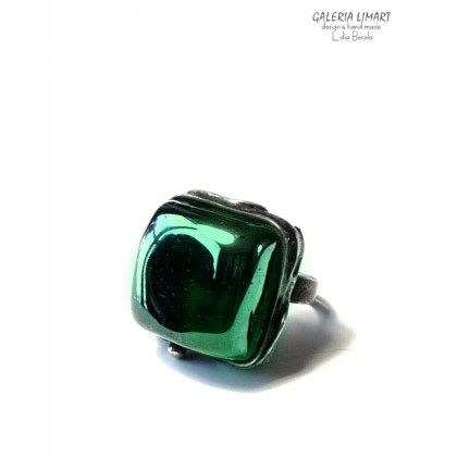 pierścionek z ręcznie przetopionego zielonego szkła witrażowego (fusing), unikatowo i ekologicznie oprawiony w technice witrażowej (stop miedzi, cynku i srebra bez ołowiu i niklu!).