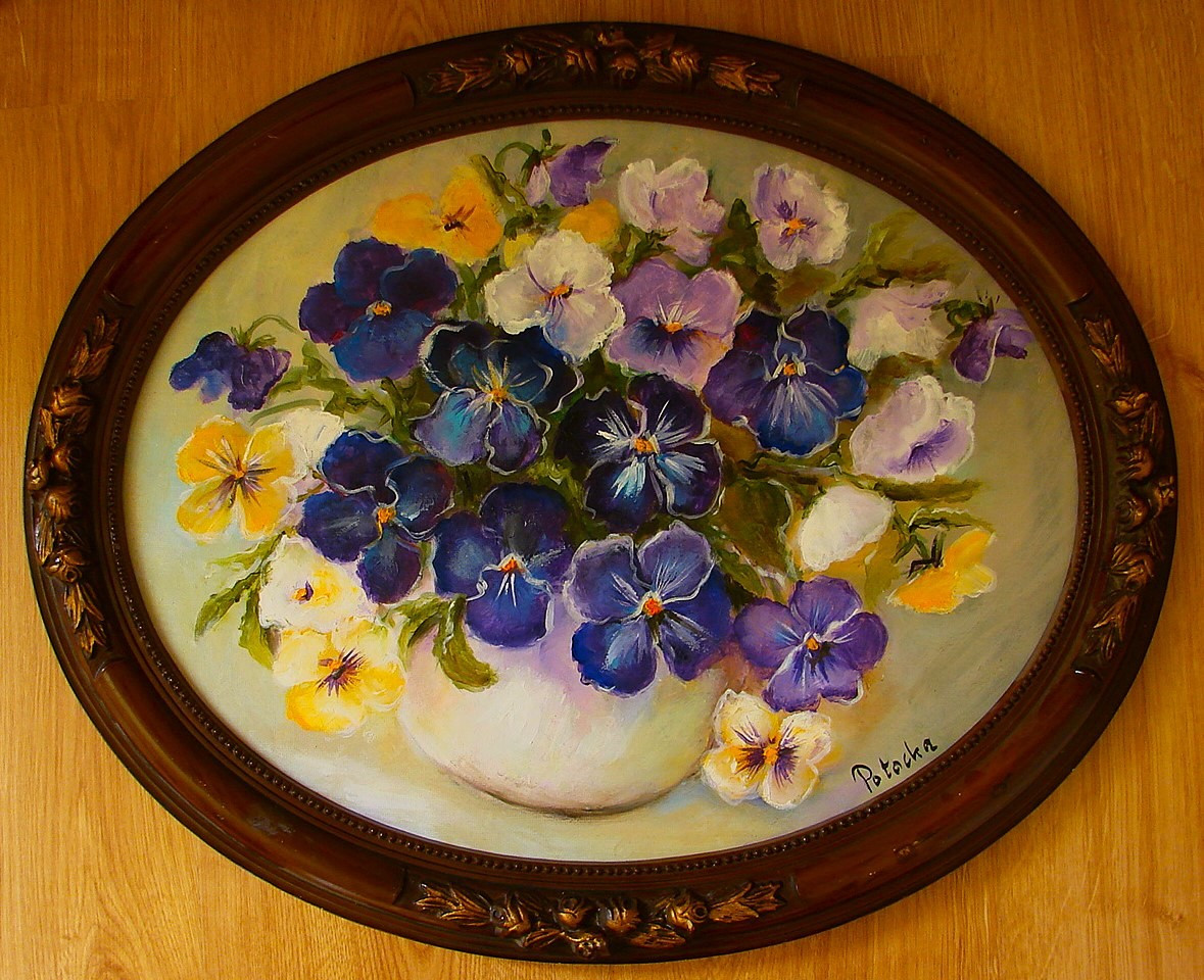 Obraz emanuje spokojem i delikatnością, przedstawiając wiązankę bratków w bogatej gamie kolorów. Fioletowe, niebieskie i żółte kwiaty tworzą harmonijną kompozycję, zrównoważoną ich subtelnym rozmieszczeniem. Kontrastujące z zielenią liści, barwy kwiatów dodają dynamiki całemu dziełu. Obraz jest zamknięty w eleganckiej, ozdobnej ramie, która nadaje mu klasyczny charakter. Atmosfera jest pełna ciepła i nostalgii, a całość wydaje się być zatrzymanym w czasie momentem wiosennego poranka.