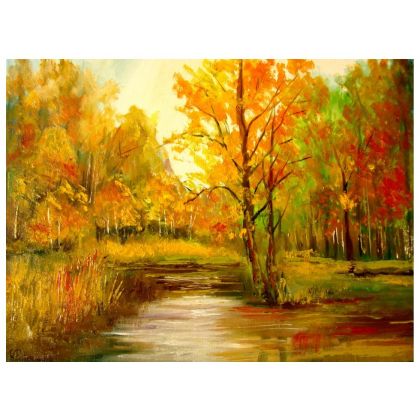 OBRAZ OLEJNY JESIEŃ PORANEK MALOWANY PĘDZLEM I SZPACHELKĄ, ROZMIAR 40-30CM, SYGNOWANY I WERNIKSOWANY.