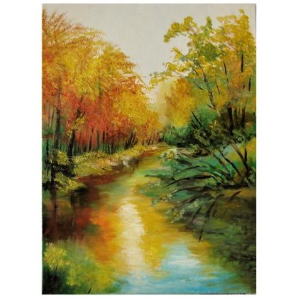 OBRAZ OLEJNY NAD WODĄ KOLORY NATURY ROZMIAR 30-40CM SYGNOWANY, WERNIKSOWANY, MALOWANY PĘDZLEM I SZPACHELKĄ,